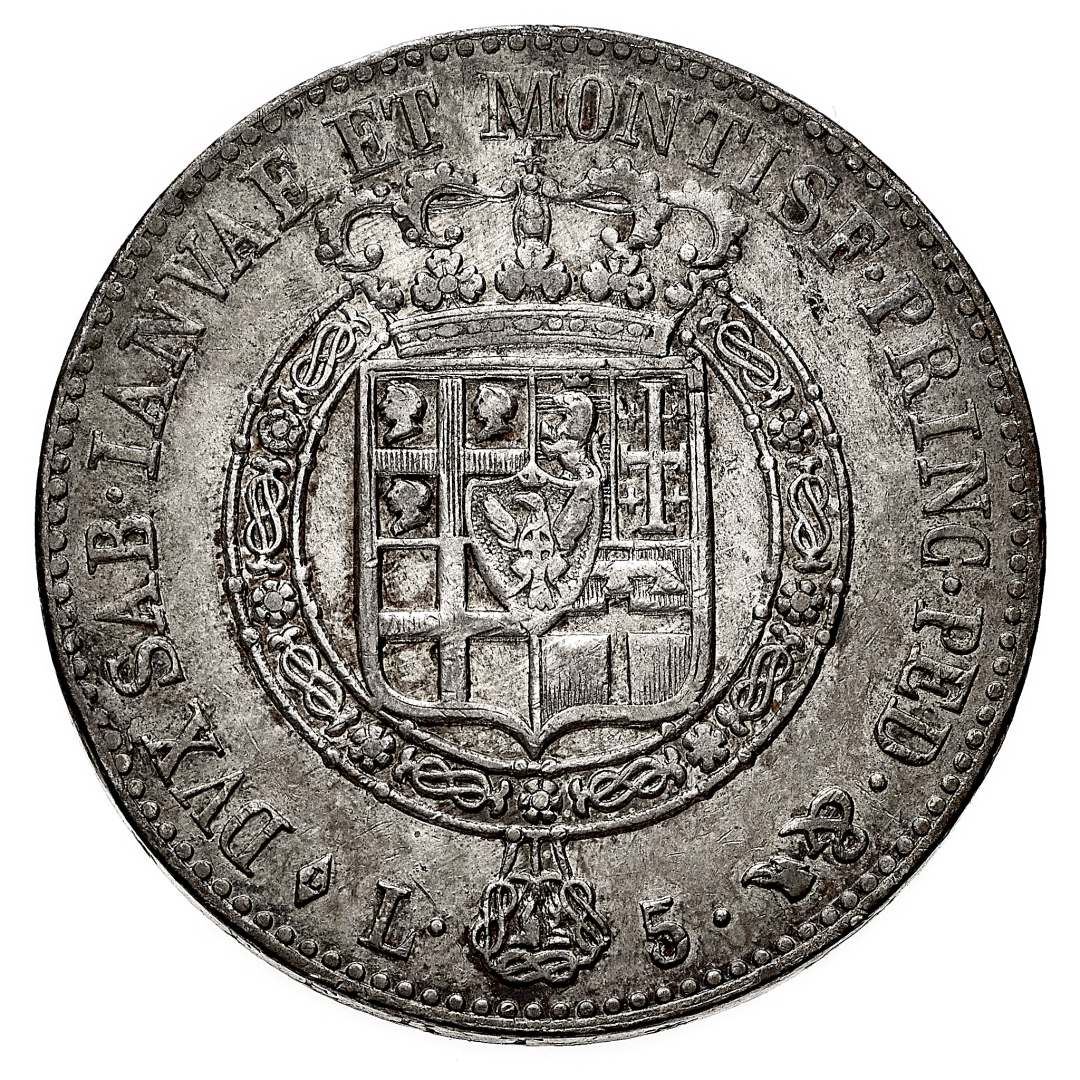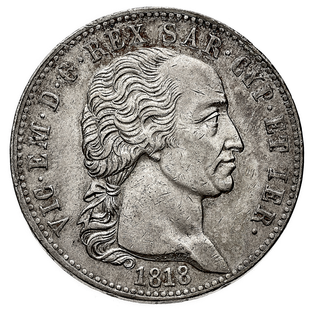 5 Lire 1818 - Zecca: Torino - Diritto: effigie del Re a destra - Rovescio: stemma compelto di Casa Savoia coronato e circondato dal Collare dell'Annunziata - gr. 24,98 - Patina di antica raccolta, q.SPL