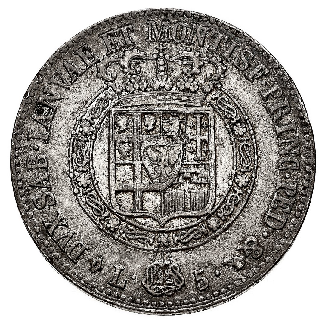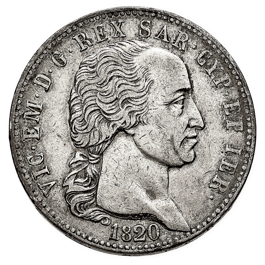 5 Lire 1820 - Zecca: Torino - Diritto: effigie del Re a destra - Rovescio: stemma completo di Casa Savoia coronato e circondato dal Collare dell'Annunziata - gr. 24,90 - BB