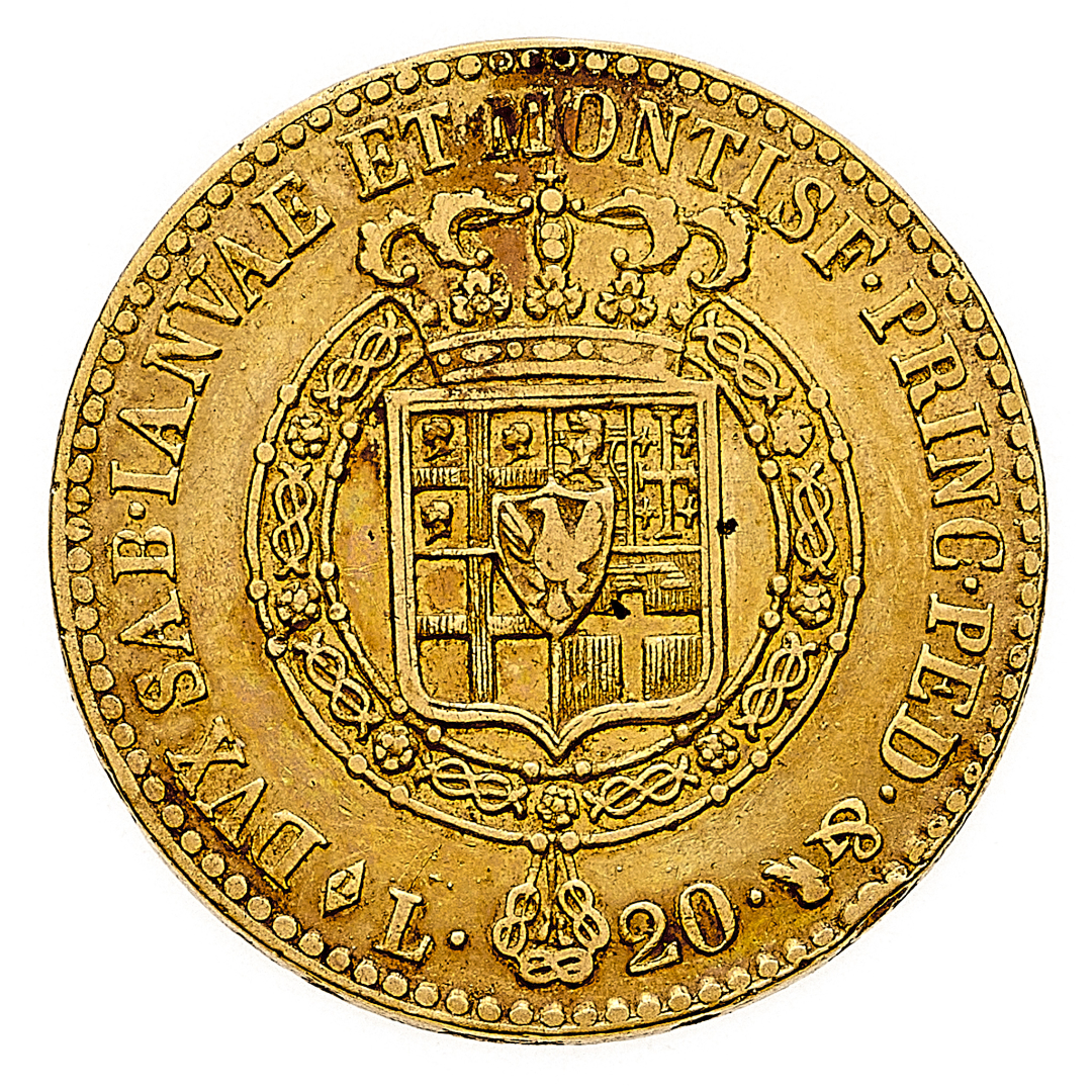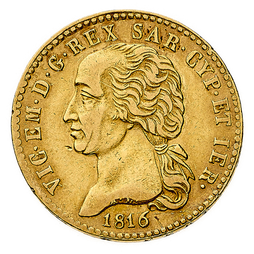20 Lire 1816 - Zecca: Torino - Diritto: effigie del Re a sinistra - Rovescio: stemma completo di Casa Savoia coronato e circondato dal Collare dell'Annunziata - gr. 6,42 - BB