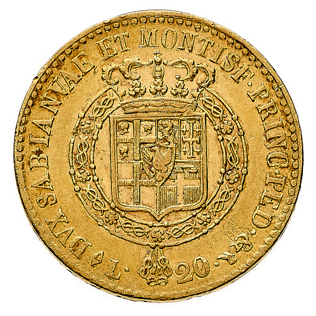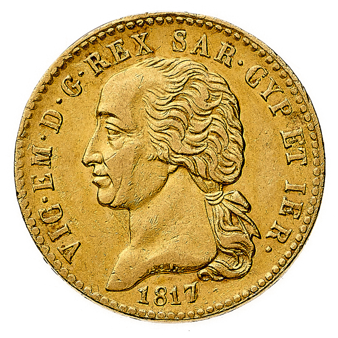 20 Lire 1817 - Zecca: Torino - Diritto: effigie del Re a sinistra - Rovescio: stemma completo di Casa Savoia coronato e circondato dal Collare dell'Annunziata - gr. 6,43 - q.SPL