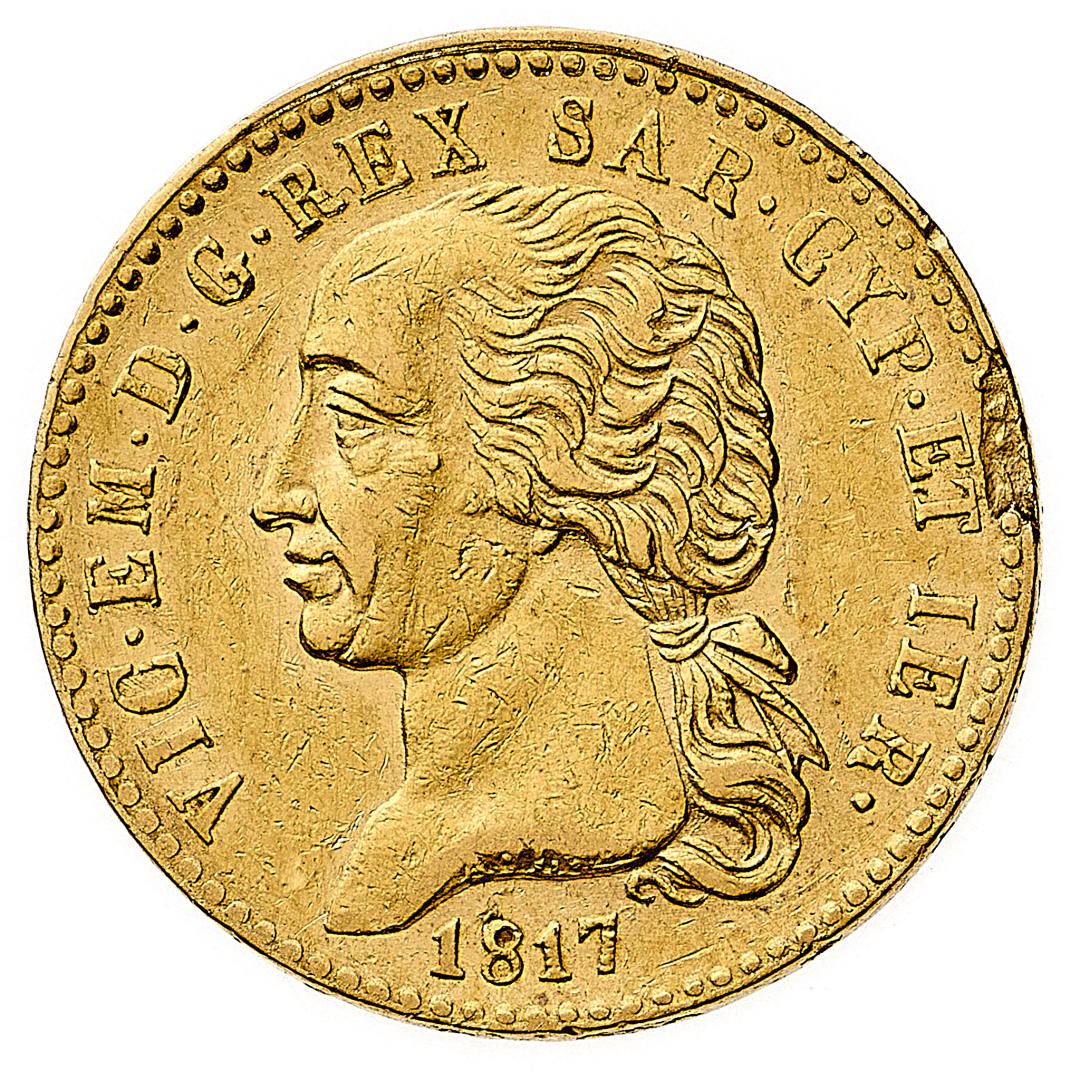 20 Lire 1817 - Zecca: Torino - Diritto: effigie del Re a sinistra - Rovescio: stemma completo di Casa Savoia coronato e circondato dal Collare dell'Annunziata - gr. 6,42 - Difetto del metallo al diritto, migliore di BB