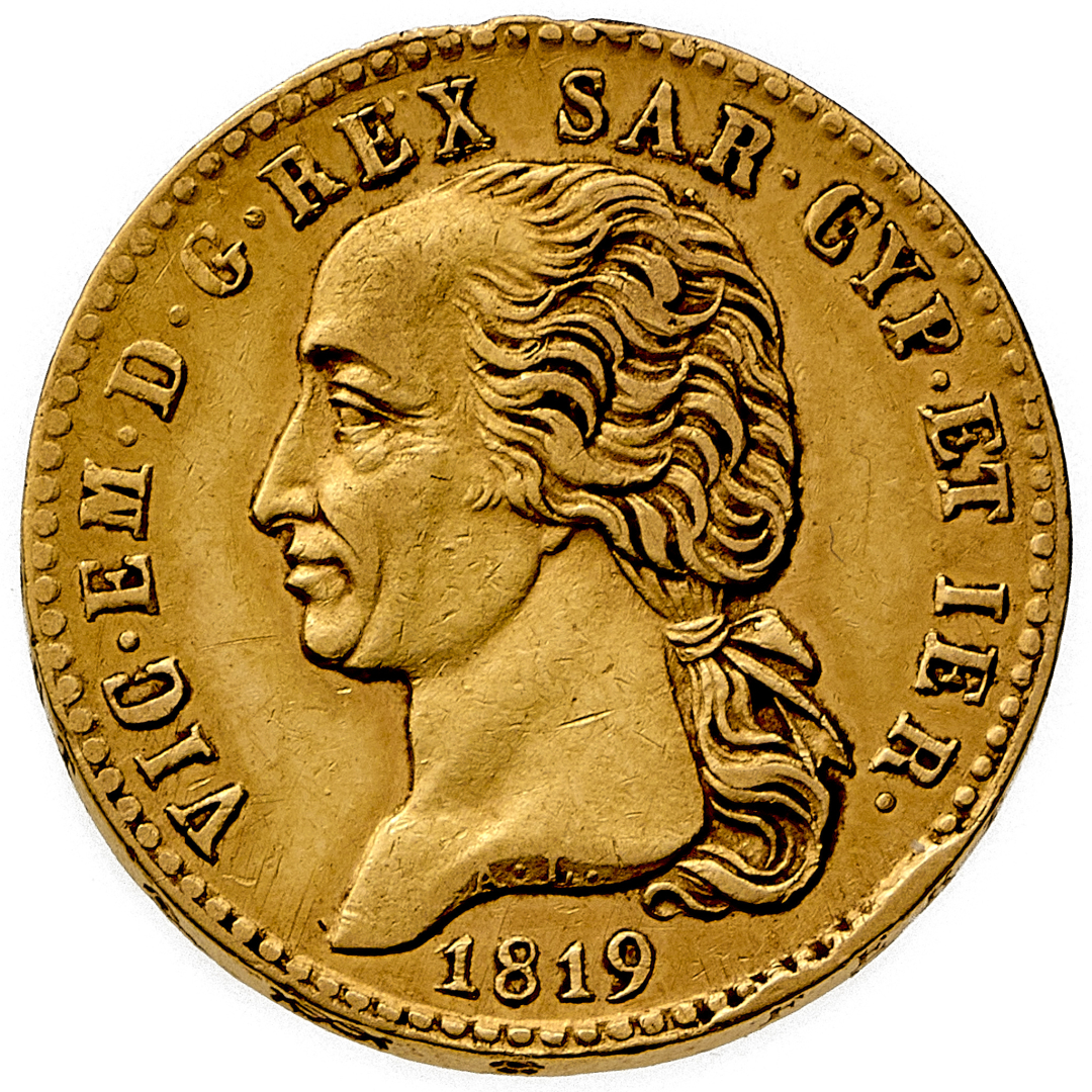 20 Lire 1819 - Zecca: Torino - Diritto: effigie del Re a sinistra - Rovescio: stemma completo di Casa Savoia coronato e circondato dal Collare dell'Annunziata - gr. 6,44 - Migliore di BB
