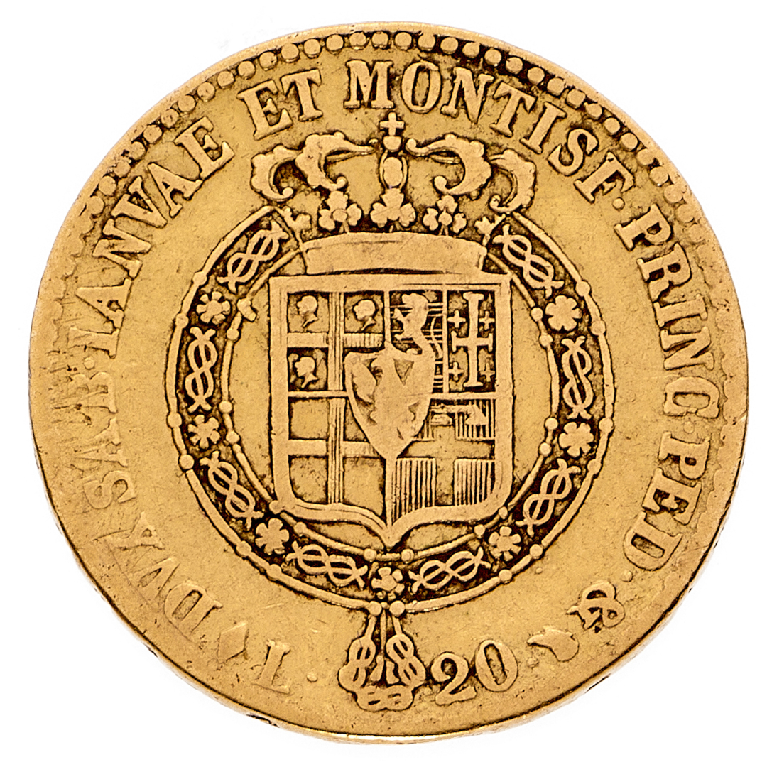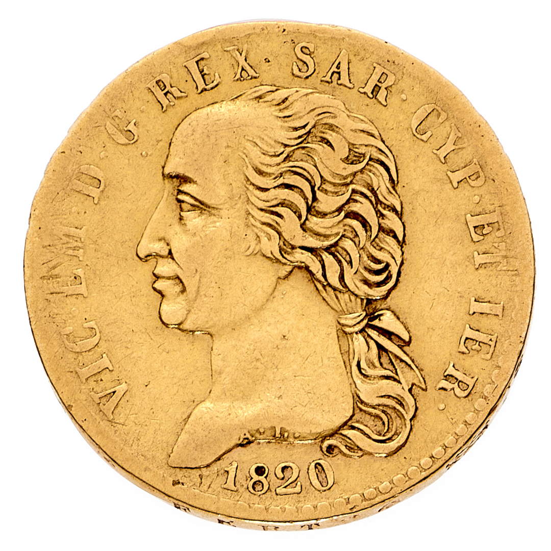 20 Lire 1820 - Zecca: Torino - Diritto: effigie del Re a sinistra - Rovescio: stemma completo di Casa Savoia coronato e circondato dal Collare dell'Annunziata - gr. 6,35 - BB