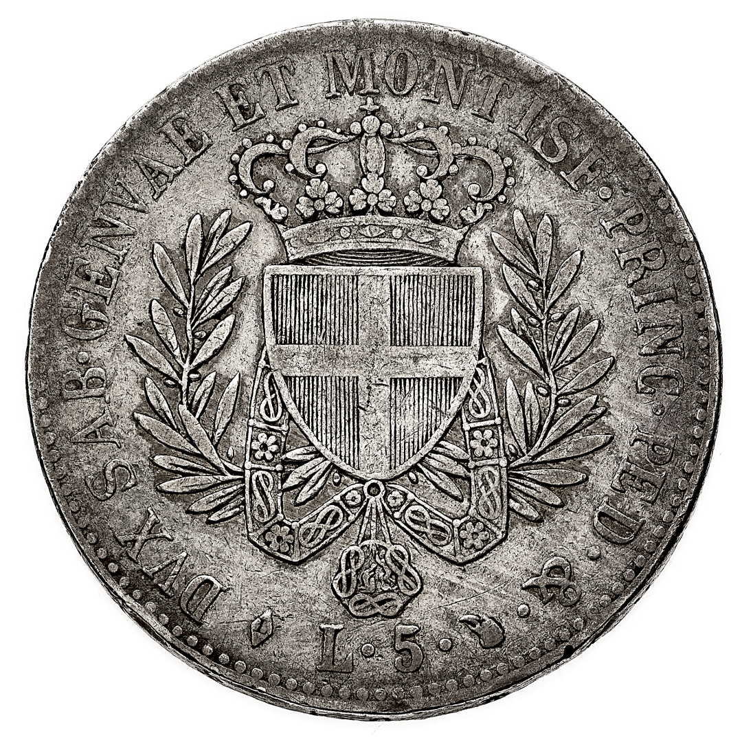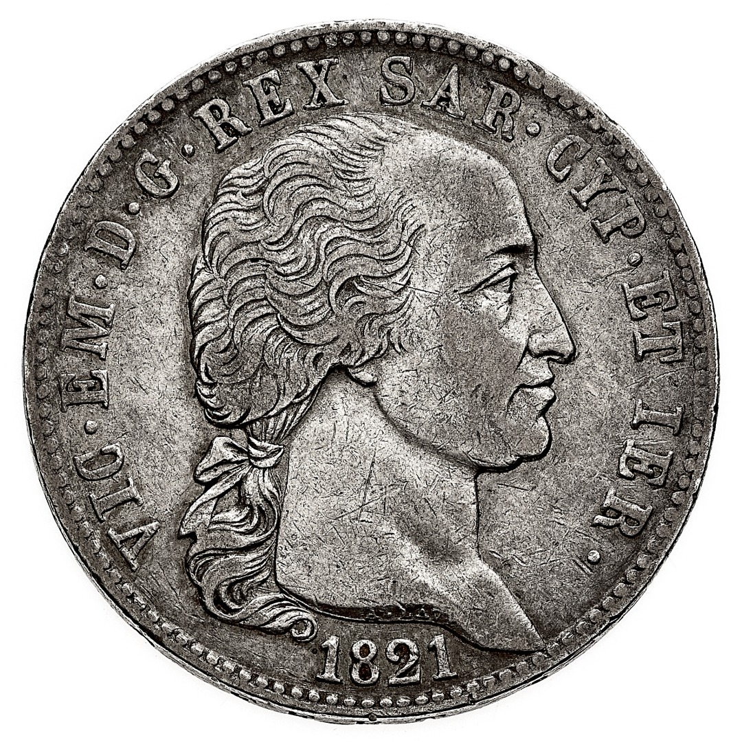 5 Lire 1821 - Zecca: Torino - Diritto: effigie del Re a destra - Rovescio: stemma completo di Casa Savoia coronato e circondato dal Collare dell'Annunziata - gr. 24,74 - Molto rara - Lievi colpetti e segni di contatto, BB
