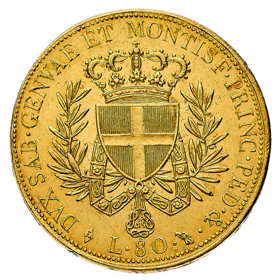 80 Lire 1821 - Zecca: Torino - Diritto: effigie del Re a sinistra - Rovescio: stemma completo di Casa Savoia coronato e circondato dal Collare dell'Annunziata - gr. 25,80 - Di grande rarità - Lievi segni di contatto, ma con fondi ancora lucenti, migliore di SPL