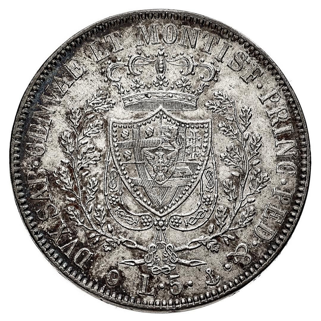 5 Lire 1829 - Zecca: Genova - Diritto: effigie del Re a destra - Rovescio: stemma completo di Casa Savoia coronato e circondato dal Collare dell'Annunziata - gr. 25,00 - Lievi segni di contatto, SPL
