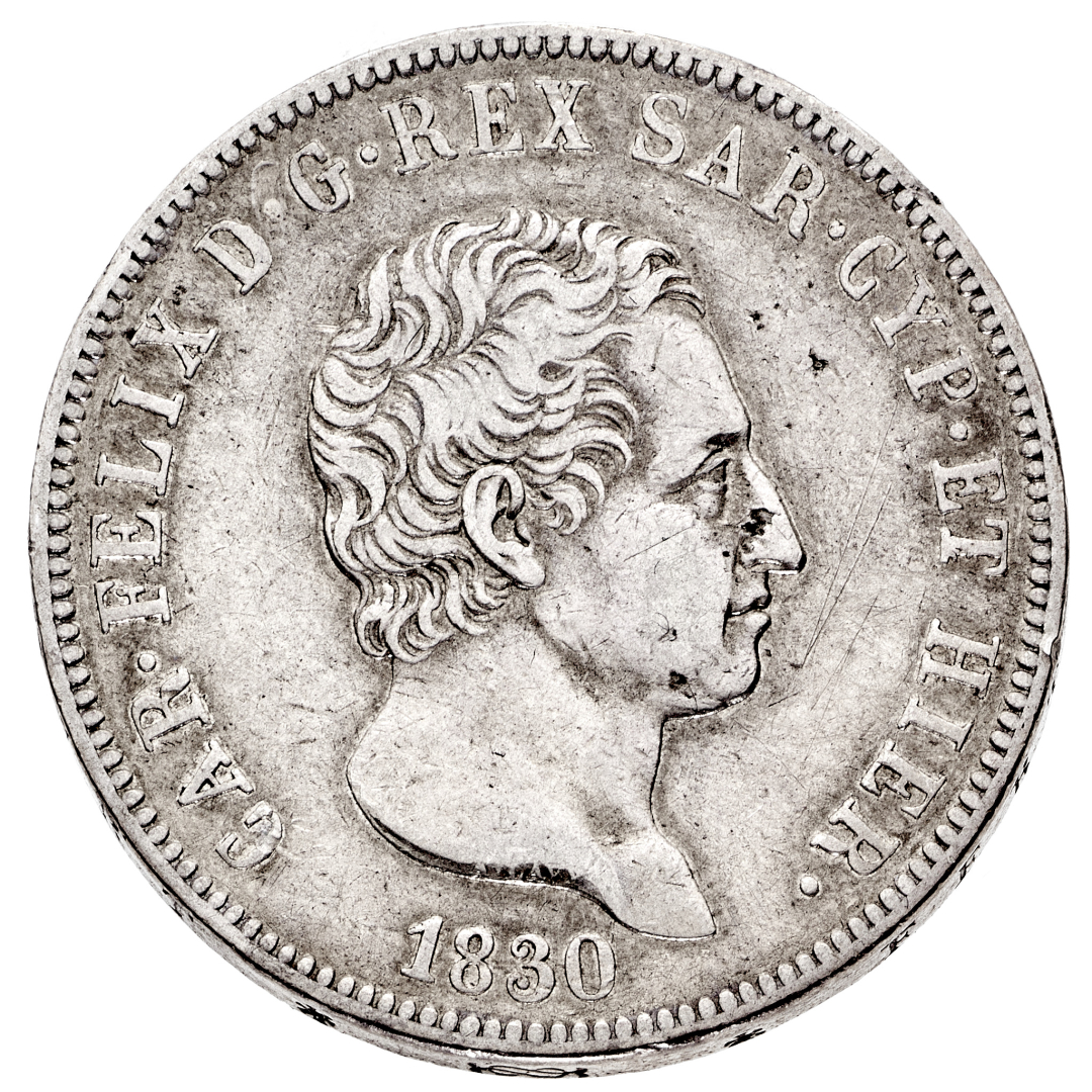 5 Lire 1830 - Zecca: Torino - Diritto: effigie del Re a destra - Rovescio: stemma completo di Casa Savoia coronato e circondato dal Collare dell'Annunziata - gr. 24,85 - BB