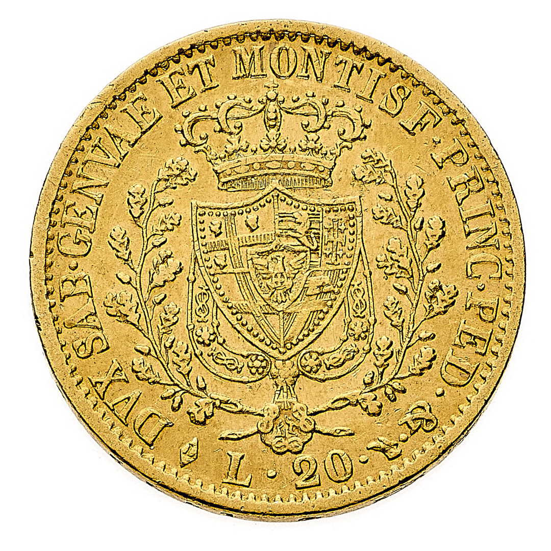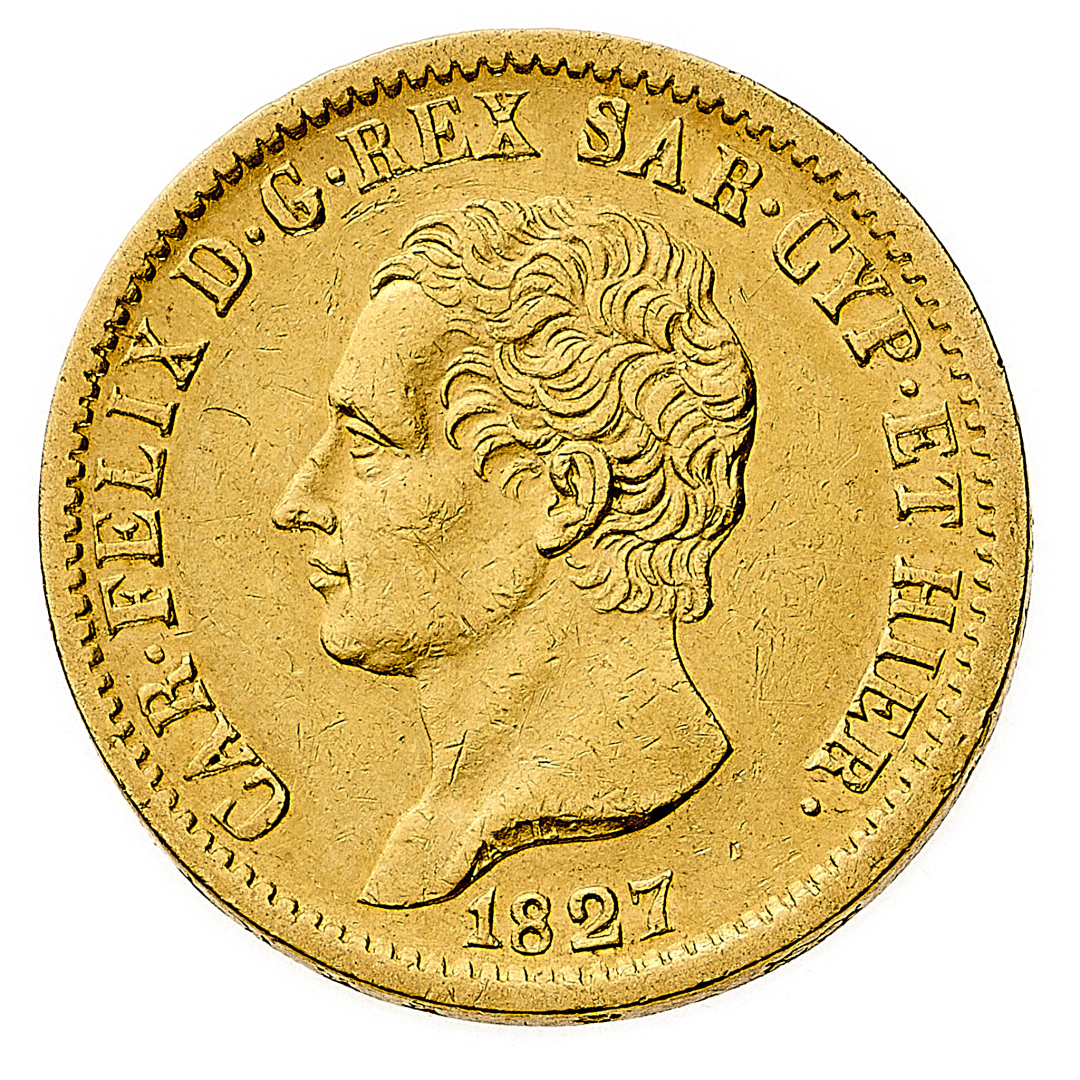 20 Lire 1827 - Zecca: Torino - Diritto: effigie del Re a sinistra - Rovescio: stemma completo di Casa Savoia coronato e circondato dal Collare dell'Annunziata entro due rami di quercia - gr. 6,44 - Lievi segni di contatto, altrimenti SPL
