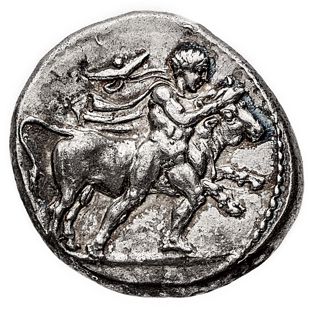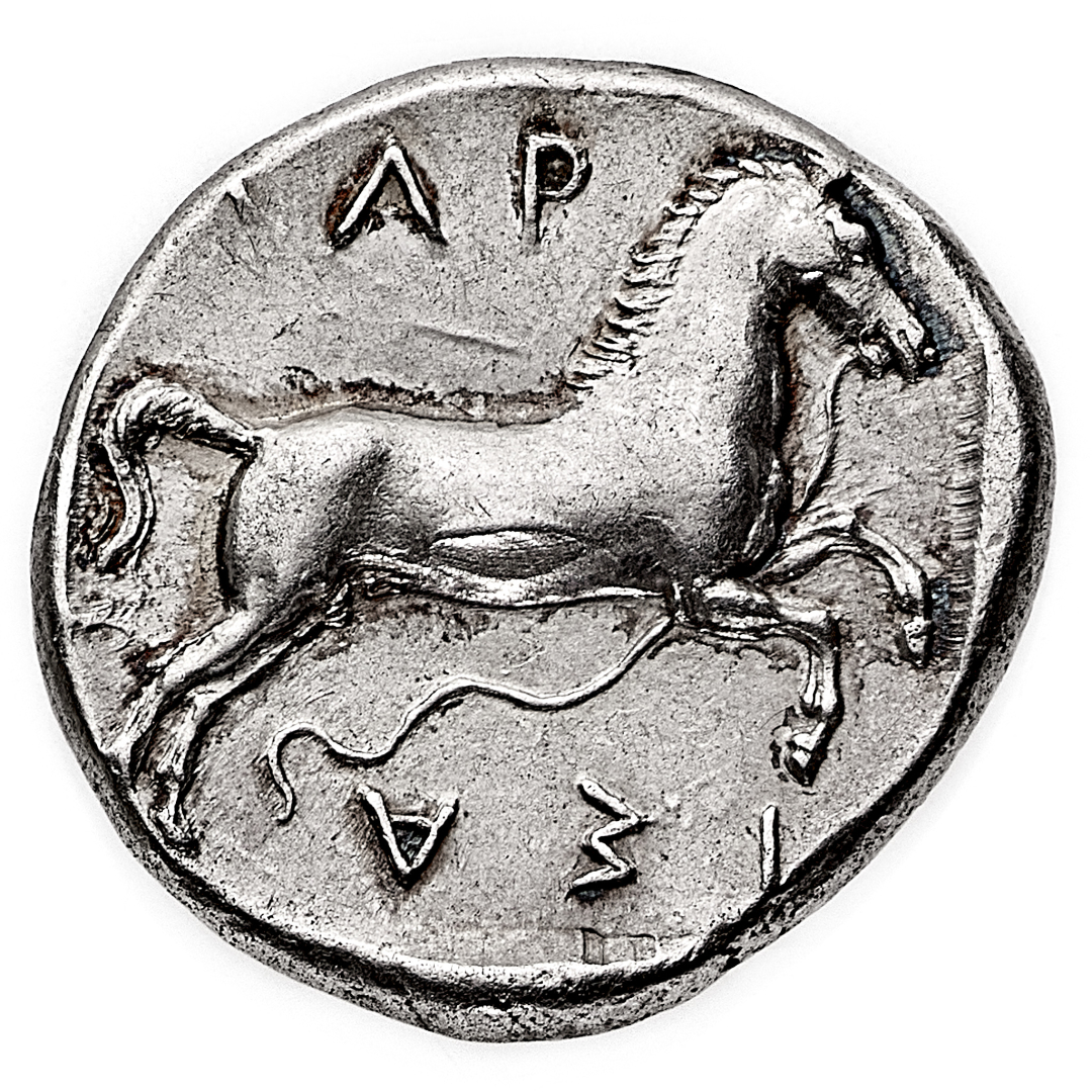 Larissa - Dracma databile al periodo 480-420 a.C. - Diritto: Thessalos stante a destra tiene un toro per le corna e il collo - Rovescio: cavallo al galoppo verso destra entro un quadrato in incuso - gr. 6,07 - Rara - Metallo lucente, SPL - Proveniente dall'asta Dr. Busso Peus Nachf. 368, Frankfurt am Main 25.4.2001, n. 129