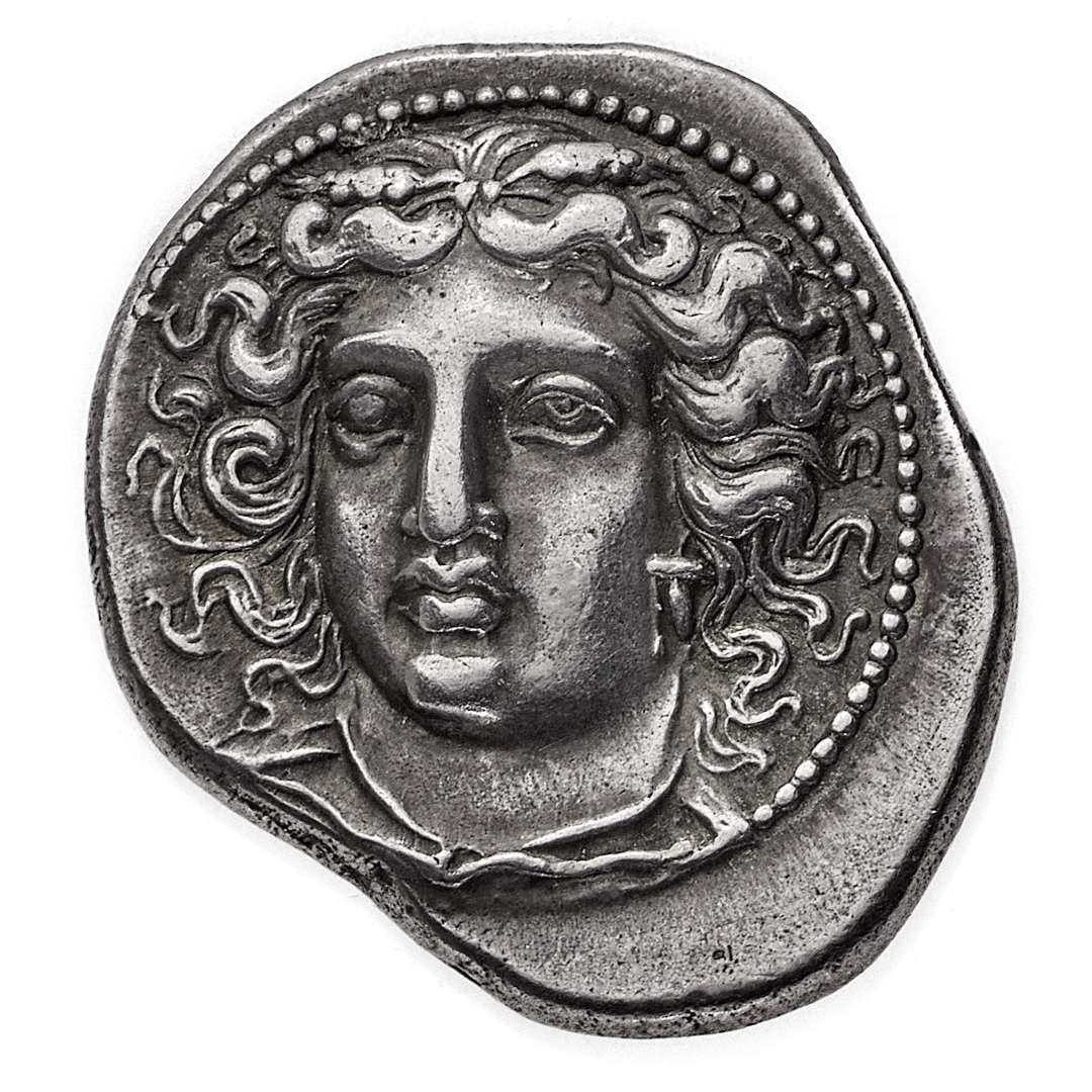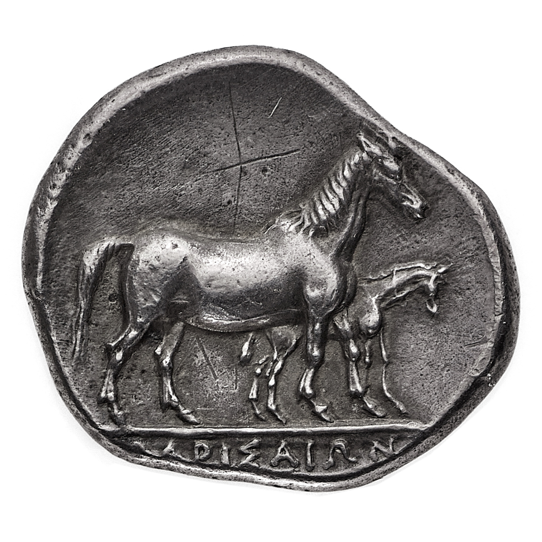 Larissa - Dracma databile al periodo 348-336 a.C. - Diritto: testa della ninfa Larissa di fronte - Rovescio: cavalla e puledro stanti a destra, con le gambe dritte - gr. 6,08 - Non comune - Patina delicata, SPL - Proveniente dall'asta Gorny&Mosch 92, Monaco di Baviera 20-21.11.1998, n. 145