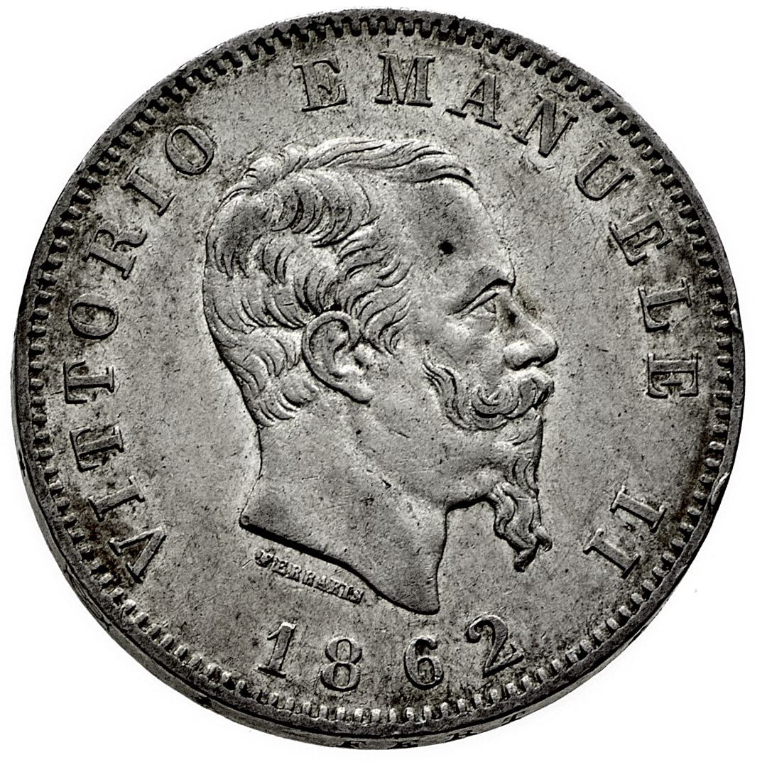 1 Lira 1862 - Zecca: Torino - Diritto: effigie del Re a destra - Rovescio: stemma di Casa Savoia coronato e circondato dal Collare dell'Annunziata - gr. 4,99 - Rara - Fondi parzialmente lucenti, q.SPL