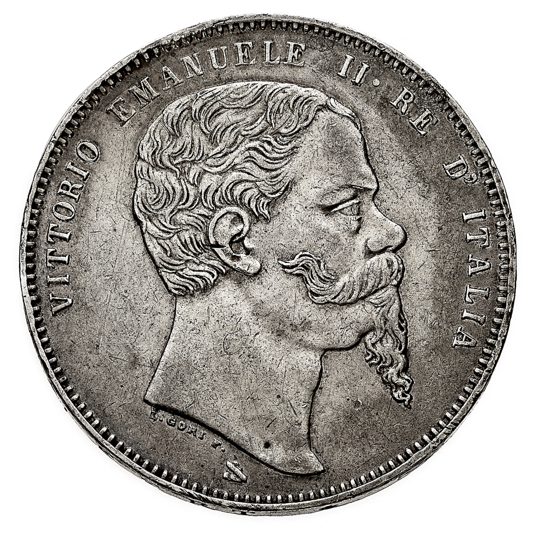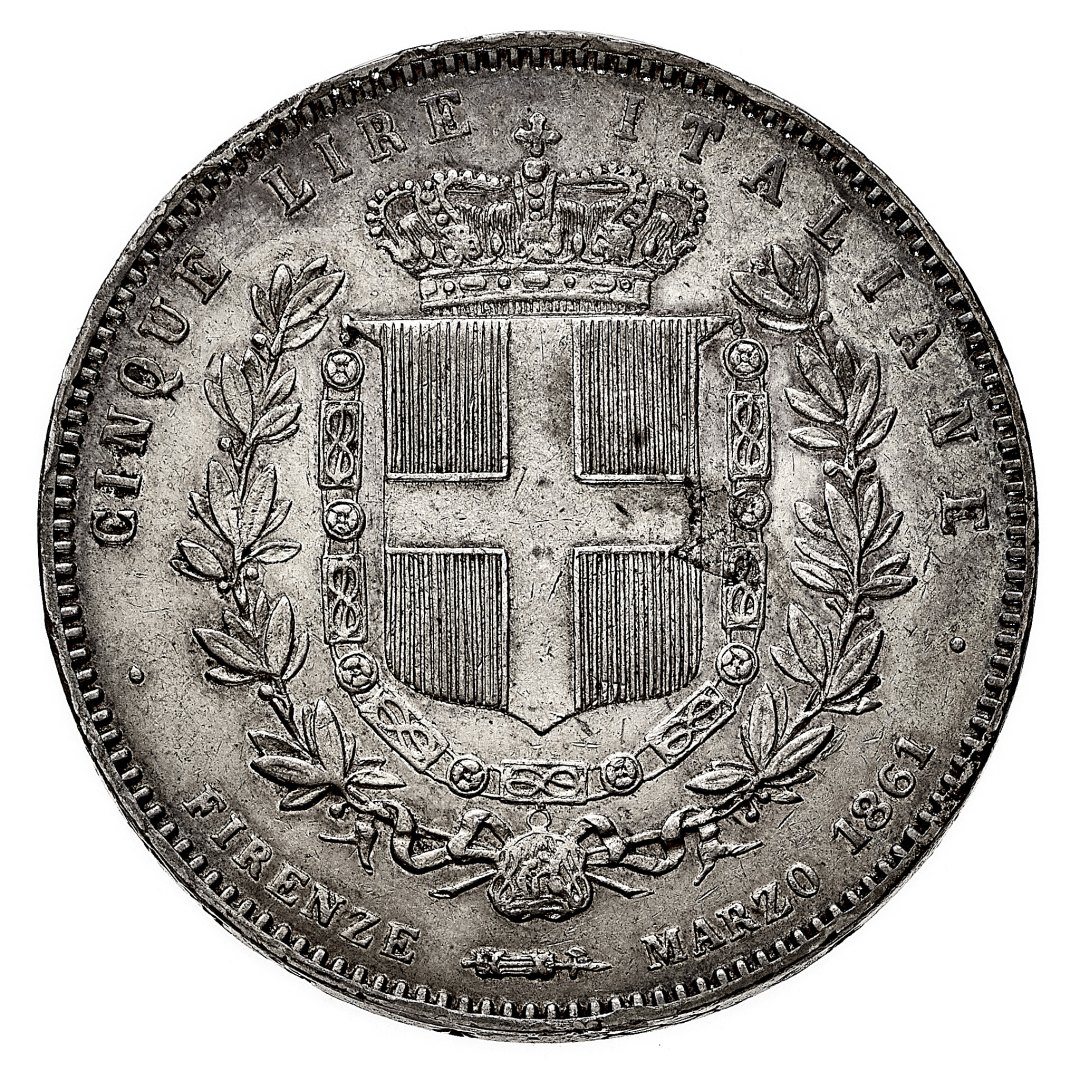 5 Lire Marzo 1861 - Zecca: Firenze - Diritto: effigie del Re a destra - Rovescio: stemma di Casa Savoia coronato e circondato dal Collare dell'Annunziata - gr. 24,97 - Rara - Lieve graffio al diritto e segni di contatto, migliore di BB