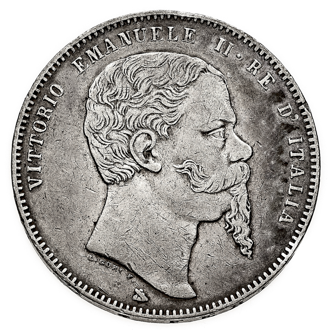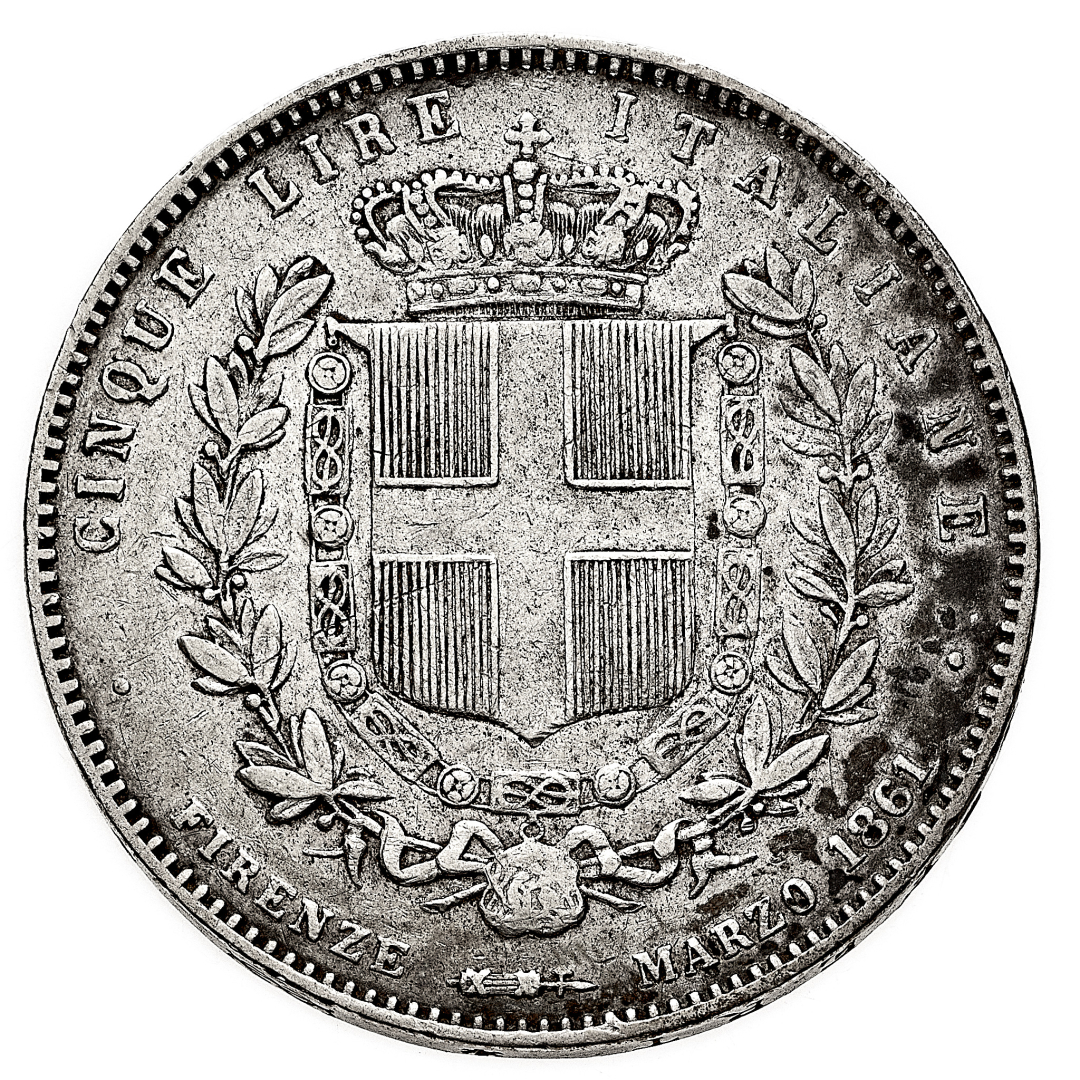5 Lire Marzo 1861 - Zecca: Firenze - Diritto: effigie del Re a destra - Rovescio: stemma di Casa Savoia coronato e circondato dal Collare dell'Annunziata - gr. 24,73 - Rara - BB