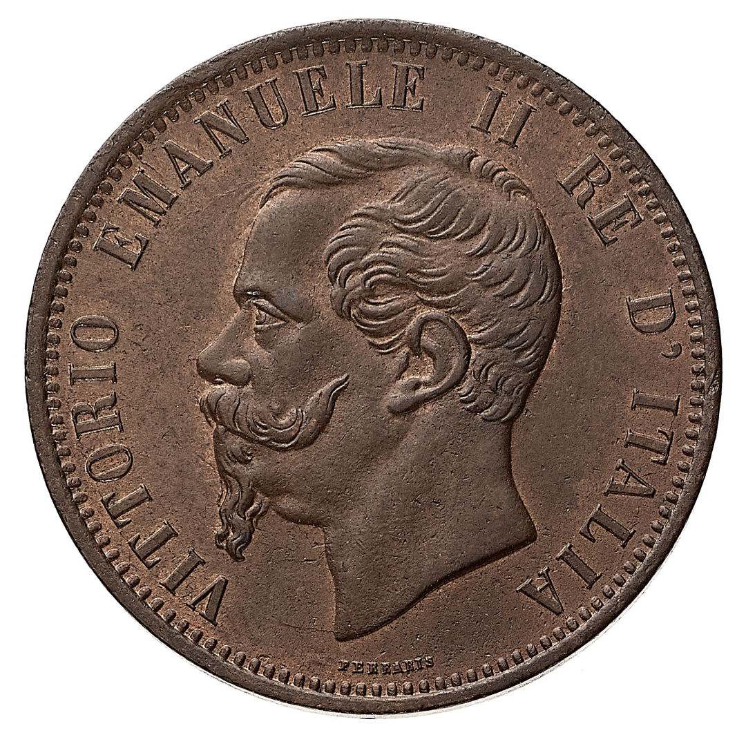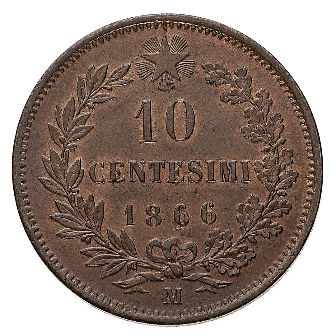 10 Centesimi 1866 - Zecca: Milano - Diritto: effigie del Re a sinistra - Rovescio: valore e data su tre righe orizzontali con alla base due rami di alloro - gr. 9,98 - Migliore di SPL