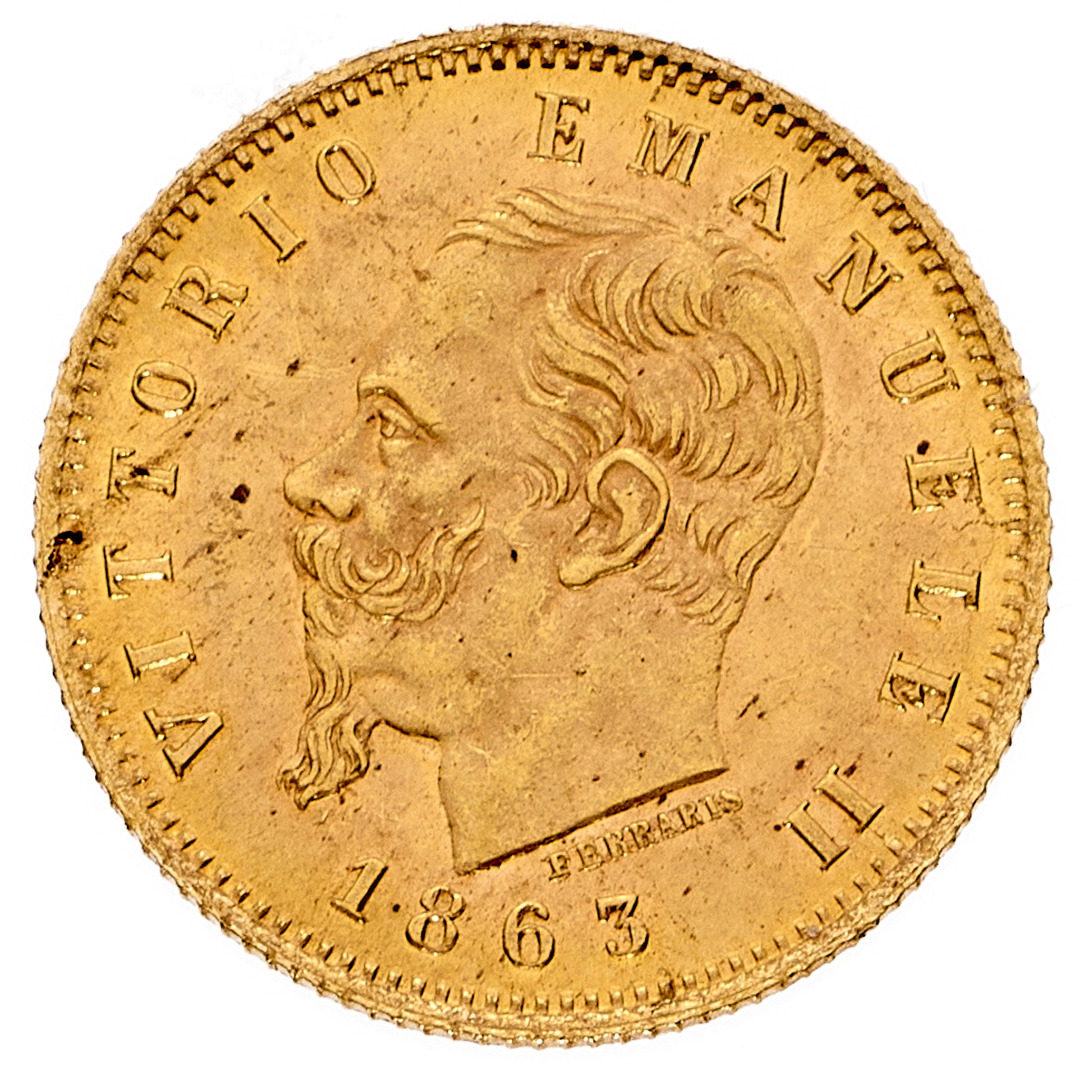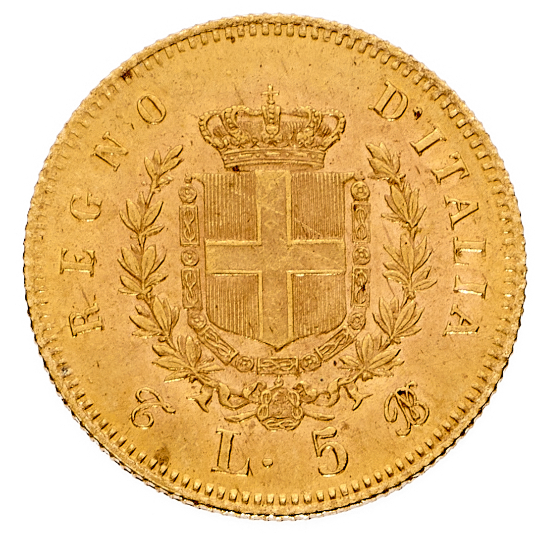 5 Lire 1863 - Zecca: Torino - Diritto: effigie del Re a sinistra - Rovescio: stemma di Casa Savoia coronato e circondato dal Collare dell'Annunziata - gr. 1,56 - Migliore di SPL