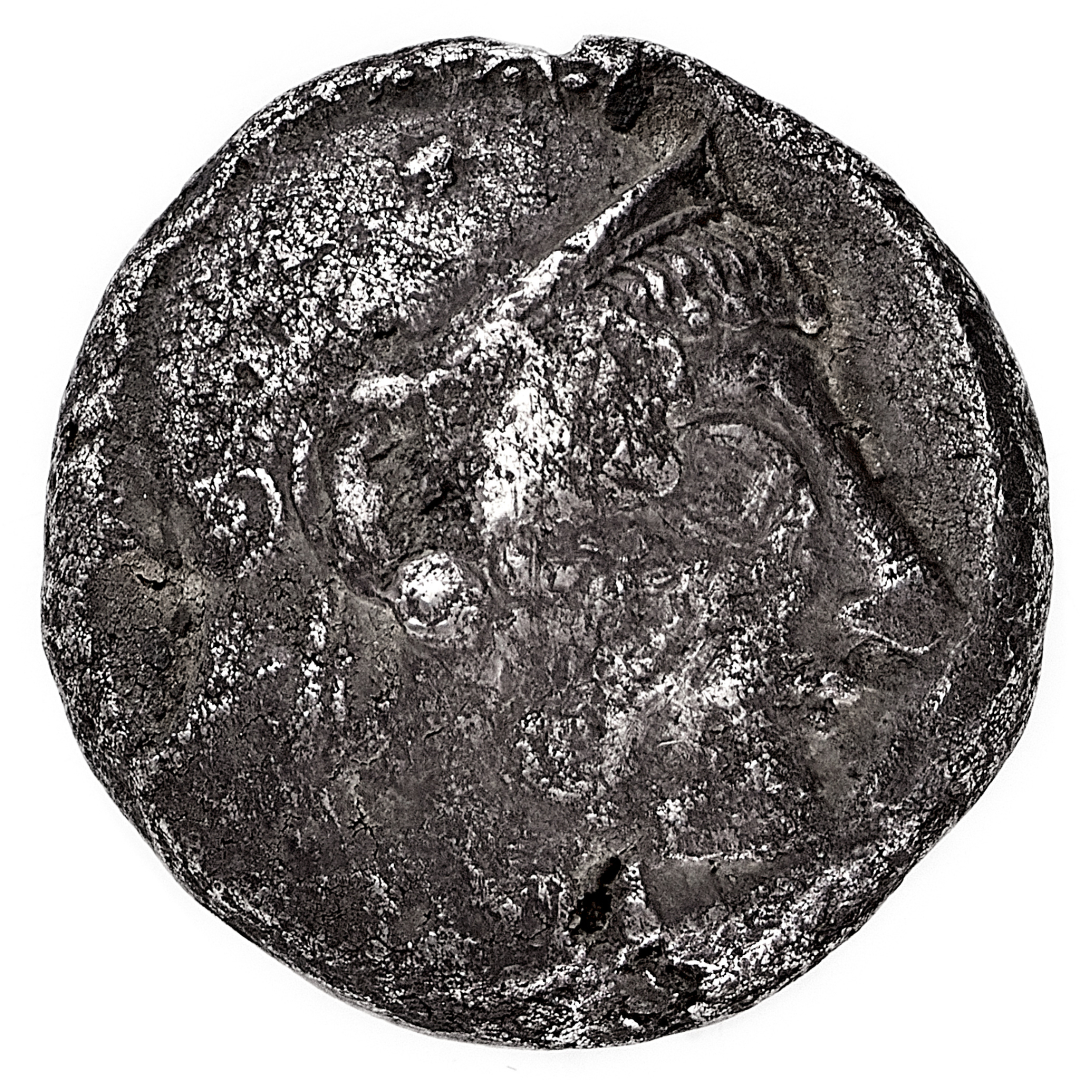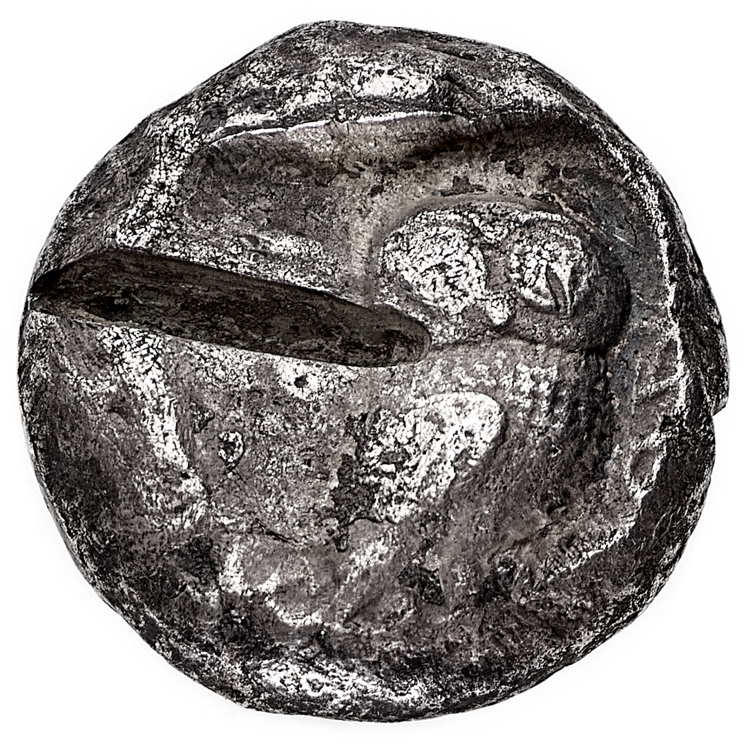 Atene - Tetradramma databile al periodo 566-490 a.C. - Diritto: testa di Atena a destra con elmo crestato e ornato di foglie - Rovescio: civetta stante a destra con la testa di fronte - gr. 17,30 - Rara - Taglio al rovescio, MB