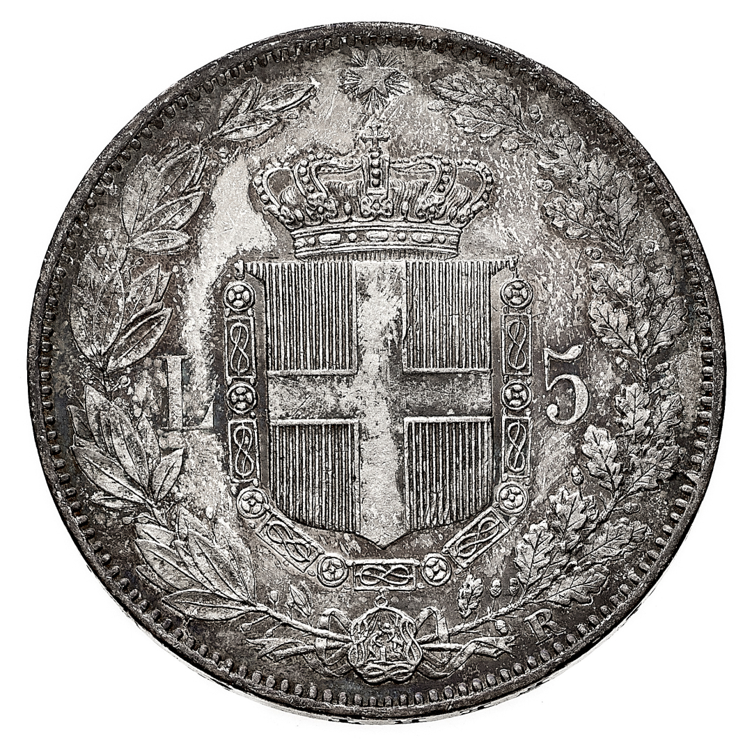 5 Lire 1878 - Zecca: Roma - Diritto: effigie del Re a destra - Rovescio: stemma di Casa Savoia coronato e circondato dal Collare dell'Annunziata - gr. 24,97 - Splendida patina iridescente, SPL