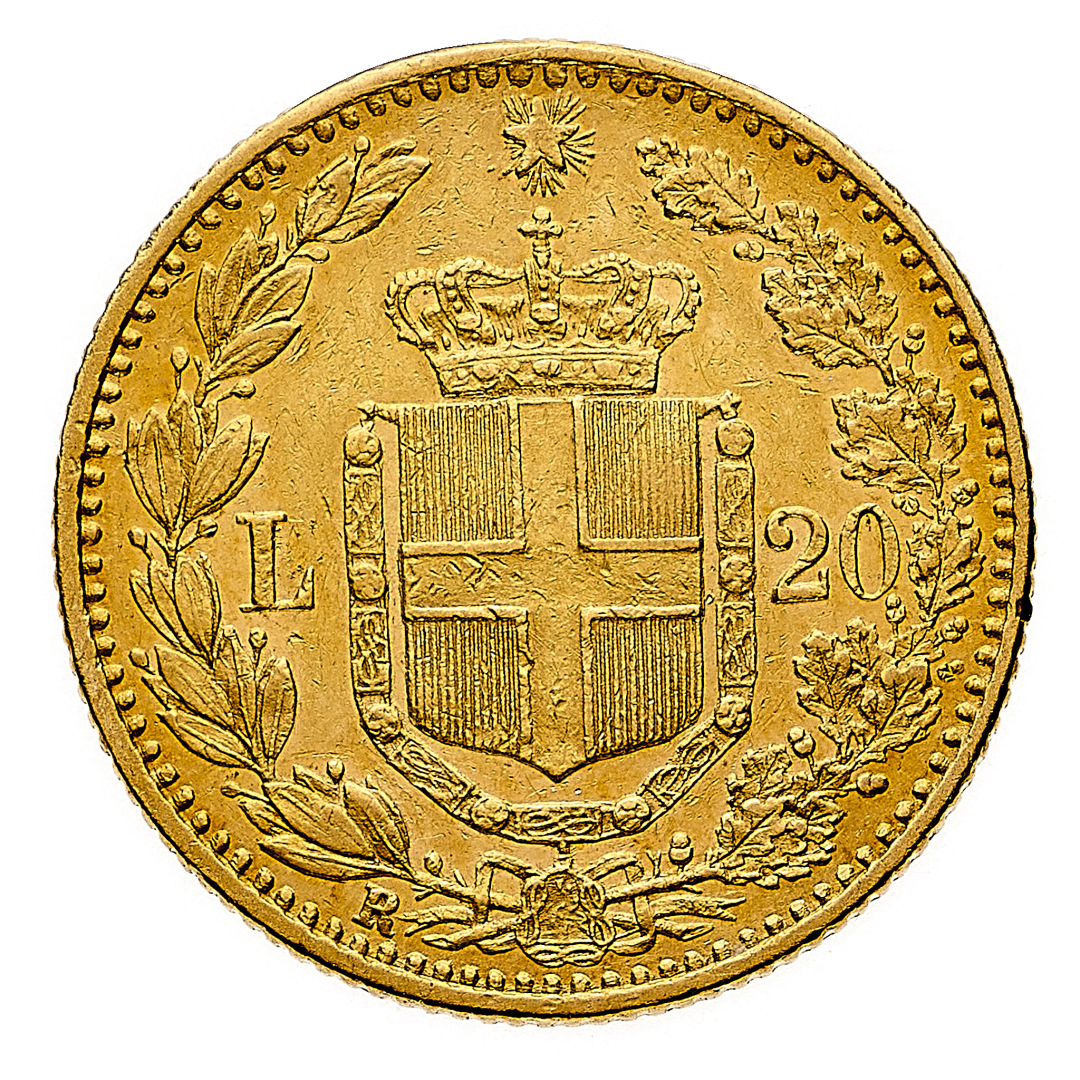 20 Lire 1884 - Zecca: Roma - Diritto: effigie del Re a sinistra - Rovescio: stemma di Casa Savoia coronato e circondato dal Collare dell'Annunziata - gr. 6,44 - Rara - q.SPL