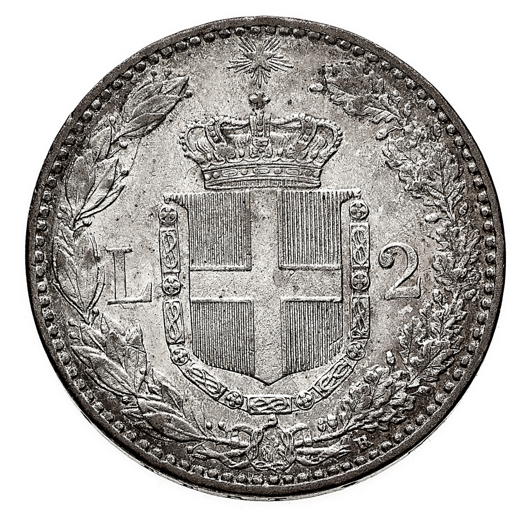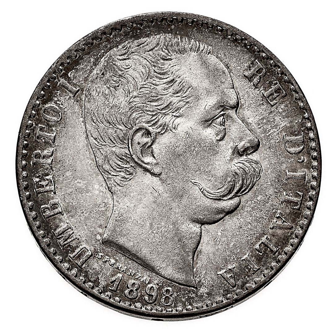 2 Lire 1898 - Zecca: Roma - Diritto: effigie del Re a destra - Rovescio: stemma di Casa Savoia coronato e circondato dal Collare dell'Annunziata - gr. 10,00 - Non comune - Migliore di SPL