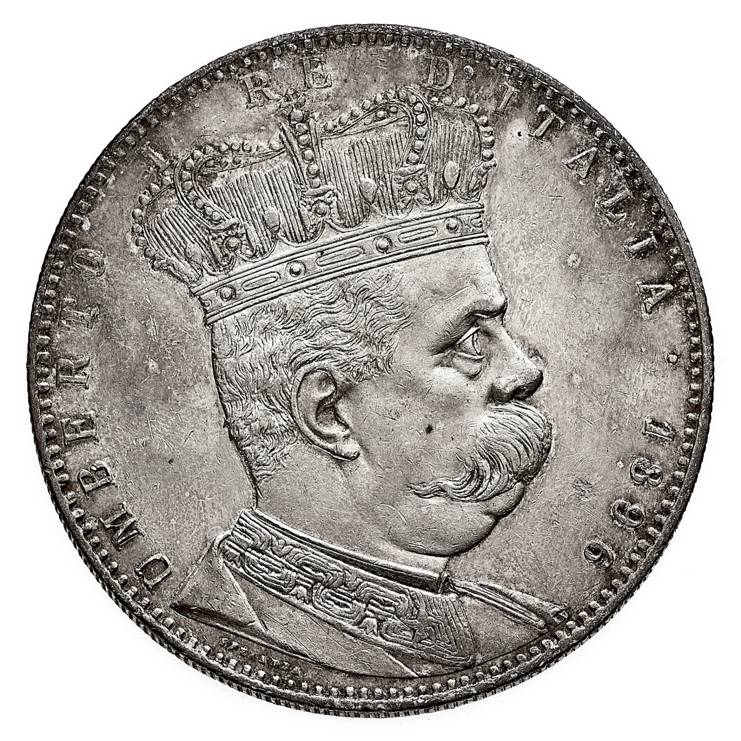 Colonie - Eritrea - Tallero da 5 Lire 1896 - Zecca: Roma - Diritto: effigie coronata del Re a destra - Rovescio: aquila ad ali spiegate con stemma sabaudo in petto, con scettro, bastone e Collare dell'Annunziata - gr. 28,07 - SPL
