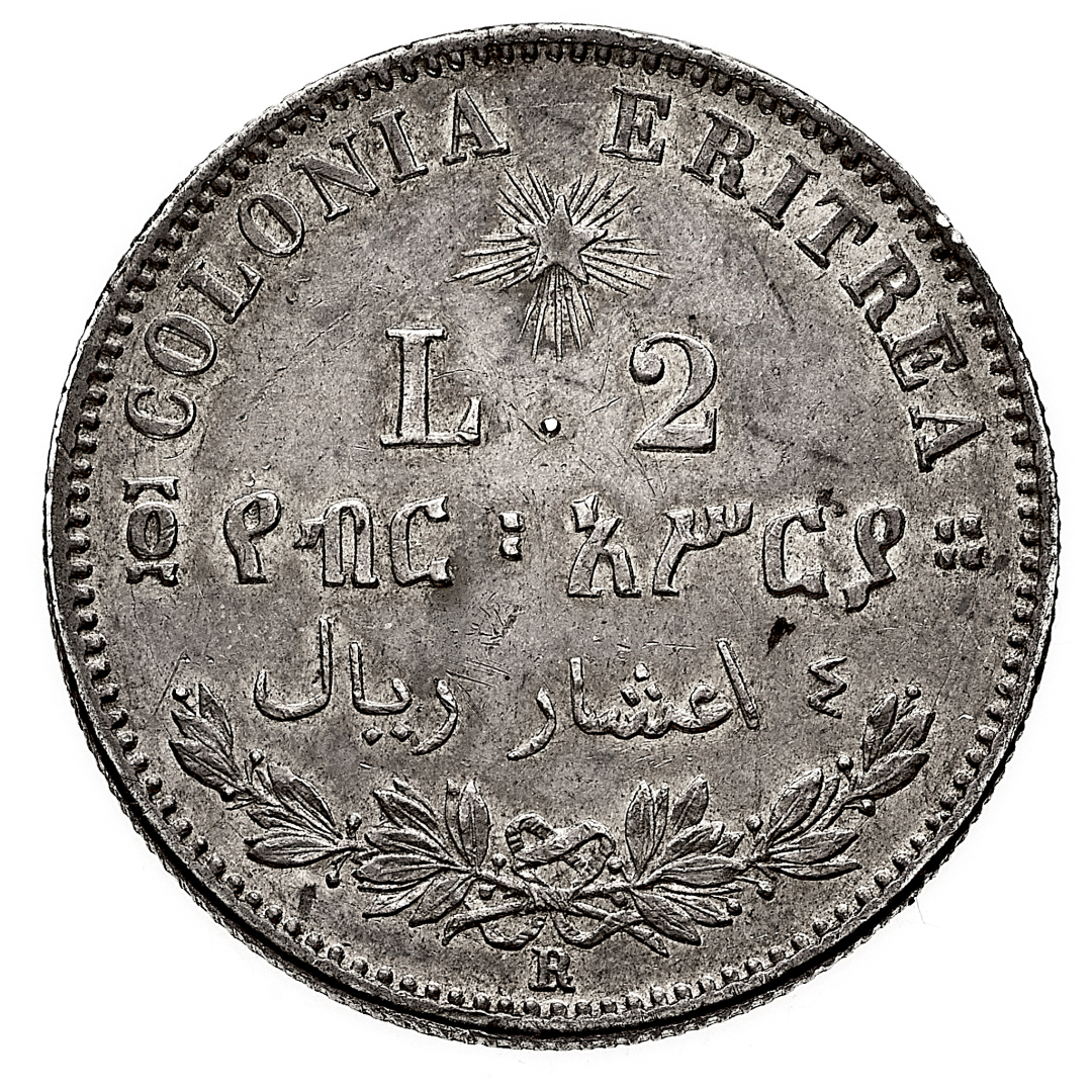 Colonie - Eritrea - 2 Lire 1890 - Zecca: Roma - Diritto: effigie coronata del Re a destra - Rovescio: valore e legenda trilingue fra stella e rami di alloro - gr. 10,00 - Migliore di SPL