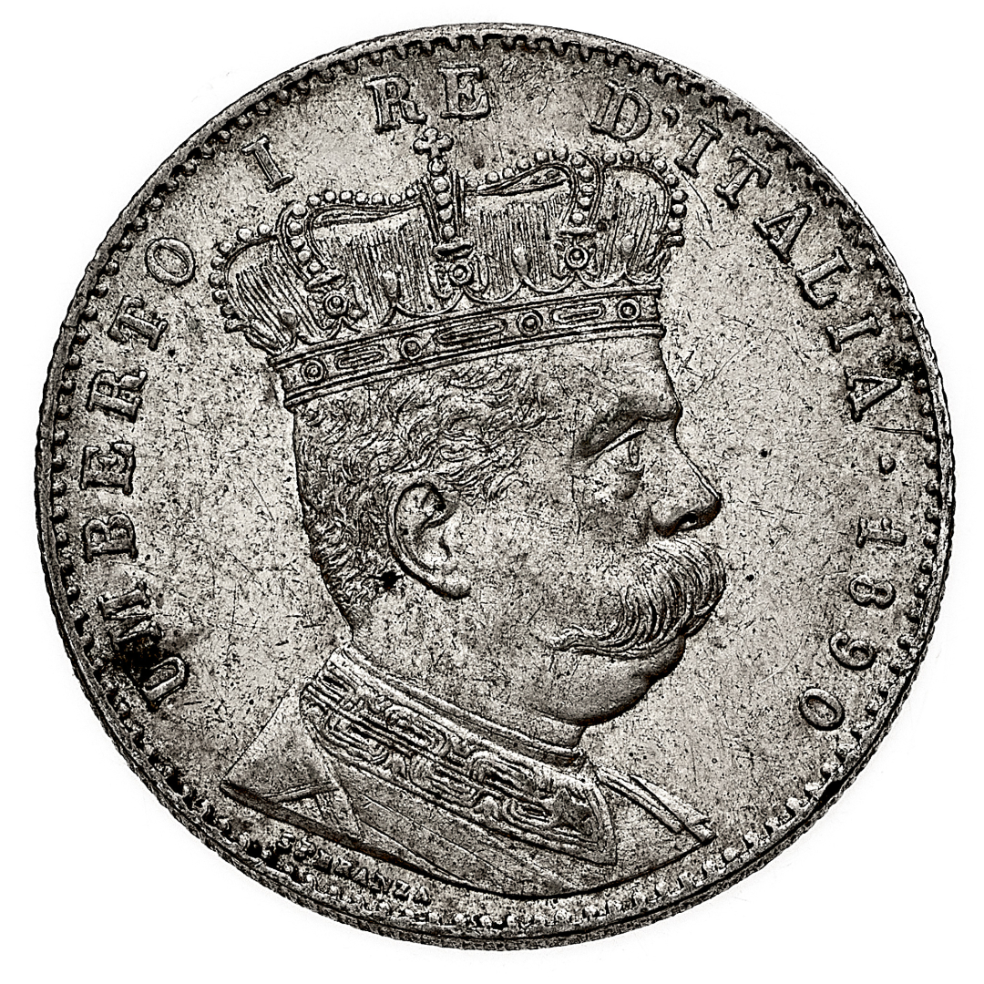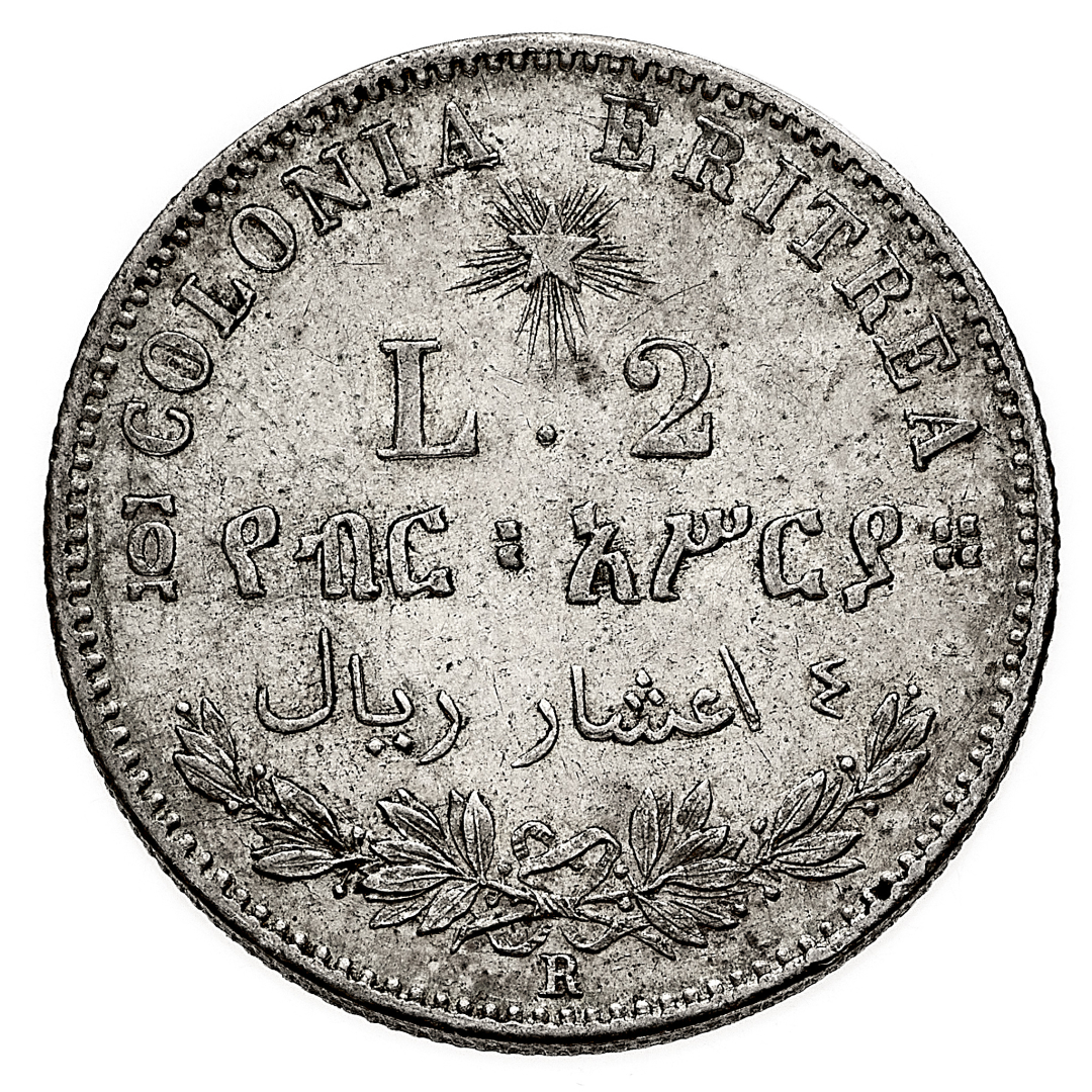 Colonie - Eritrea - 2 Lire 1890 - Zecca: Roma - Diritto: effigie coronata del Re a destra - Rovescio: valore e data trilingue fra stelle e rami di alloro - gr. 9,97 - Fondi ancora lucenti, SPL