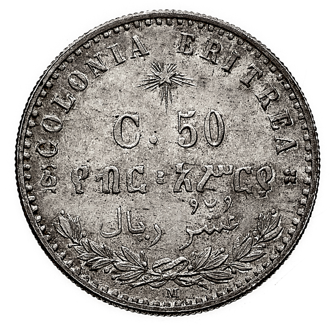 Colonie - Eritrea - 50 Centesimi 1890 - Zecca: Milano - Diritto: effigie del Re a destra - Rovescio: valore e legenda trilingue fra stella e rami di alloro - gr. 2,53 - Splendidi fondi lucenti, migliore di SPL - Ex collezione Avv. Bruno Segre
