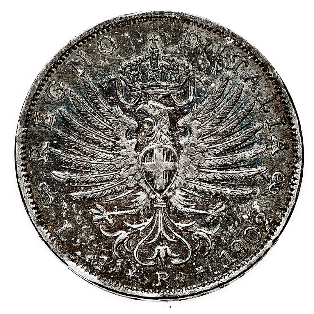 1 Lira Aquila Sabauda 1902 - Zecca: Roma - Diritto: effigie del Re a destra - Rovescio: aquila coronata ad ali spiegate con stemma sabaudo in petto - gr. 5,00 - Patina iridescente al rovescio, migliore di SPL