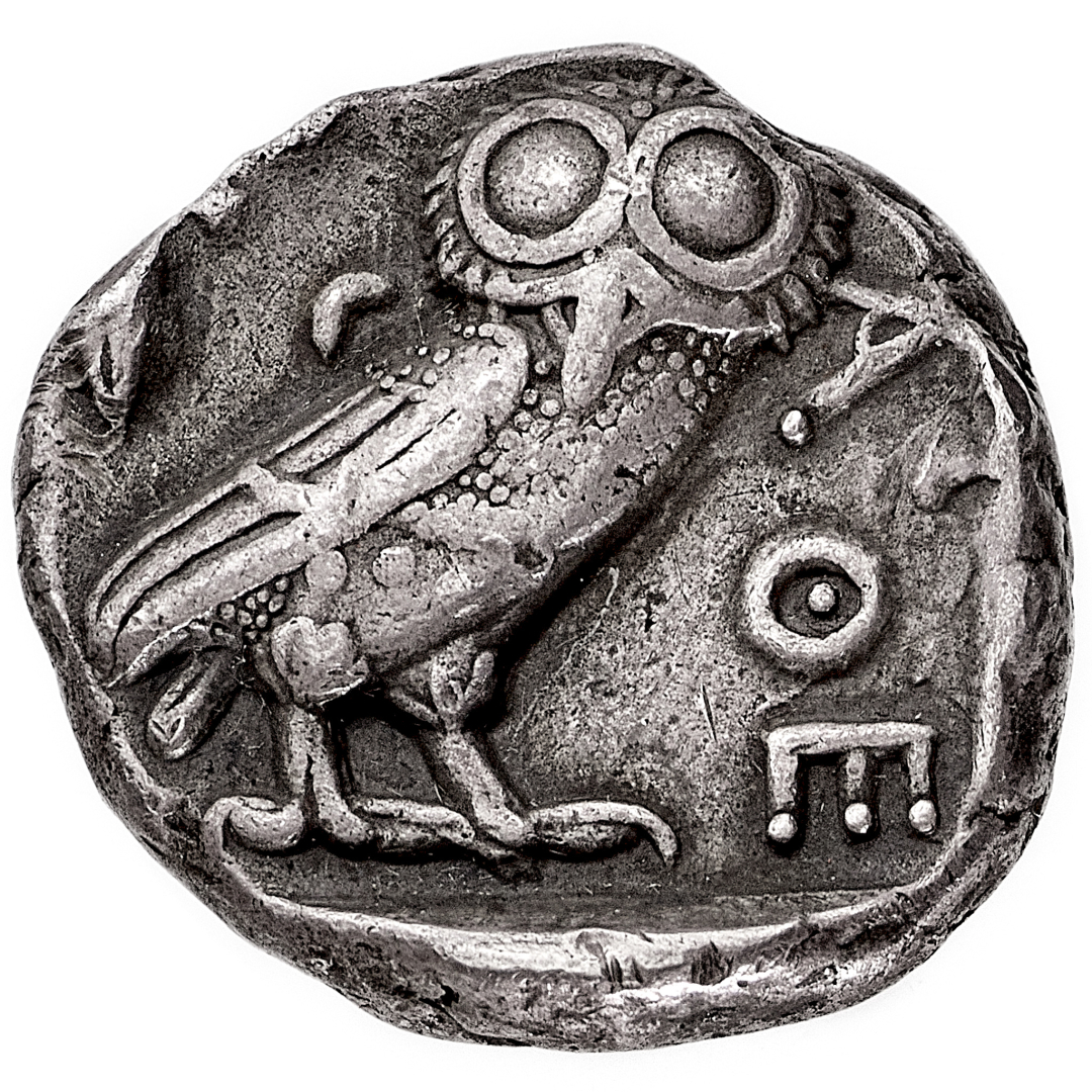 Atene - Tetradramma databile al periodo 440-404 a.C. - Diritto: testa di Atena a destra con elmo crestato e ornato di foglie - Rovescio: civetta stante a destra con la testa di fronte; in alto a sinistra un ramoscello d'ulivo e un crescente di luna - gr. 17,04 - Migliore di BB
