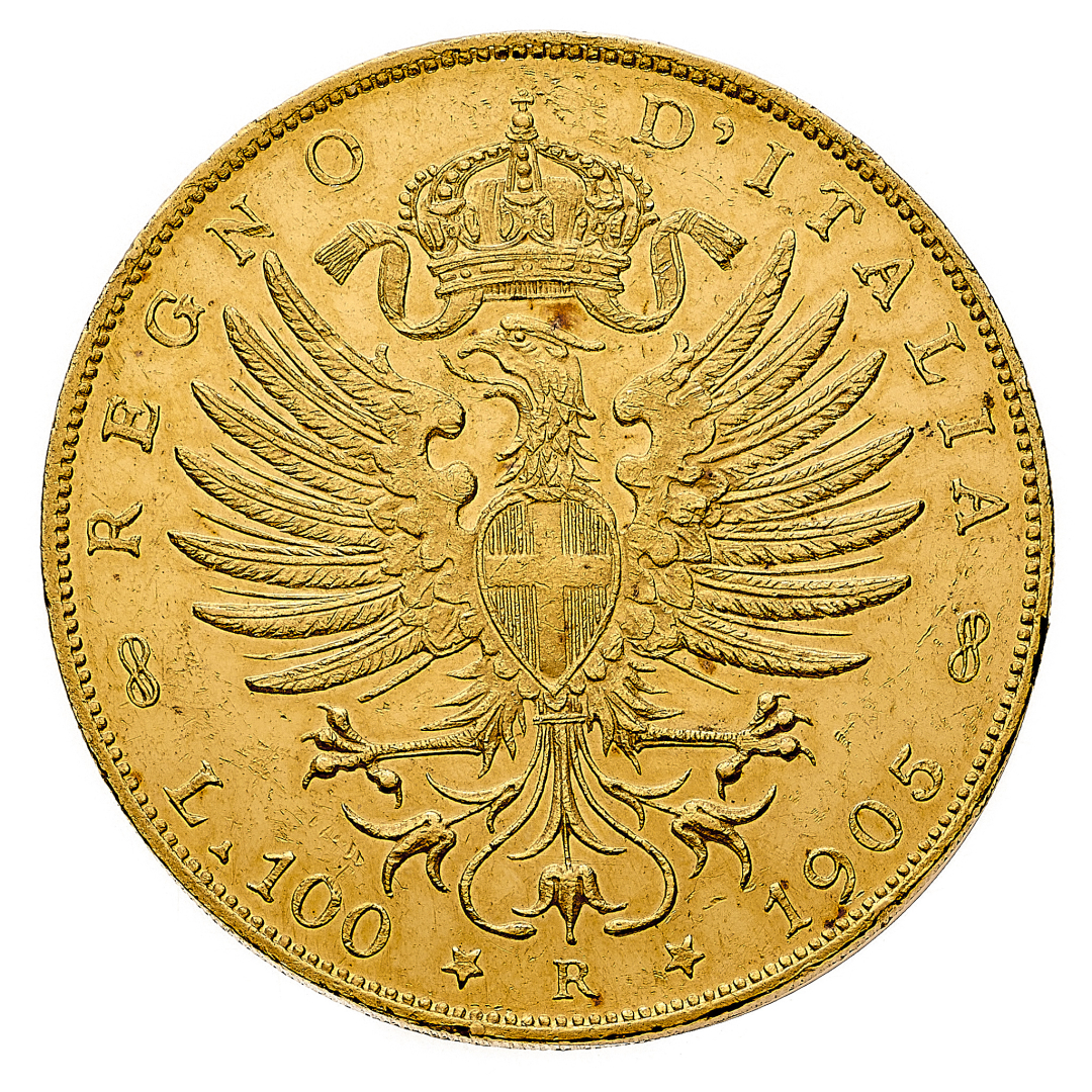 100 Lire Aquila Sabauda 1905 - Zecca: Roma - Diritto: effigie del Re a sinistra - Rovescio: aquila coronata ad ali spiegate con stemma sabaudo in petto - gr. 32,25 - Rara - Lievi segni di contatto, q.FDC