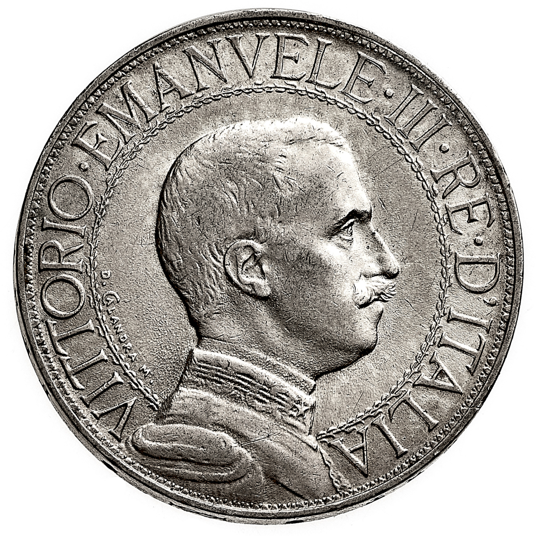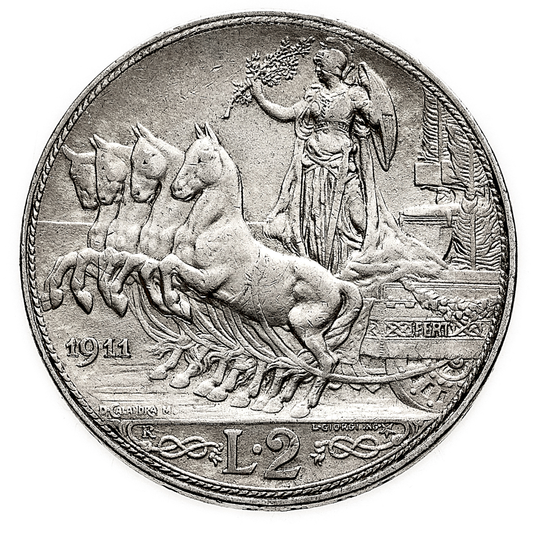 2 Lire Quadriga Veloce 1911 - Zecca: Roma - Diritto: effigie del Re a destra - Rovescio: l'Italia elmata con scudo e ramo d'ulivo su quadriga veloce a sinistra - gr. 10,00 - Rara - SPL