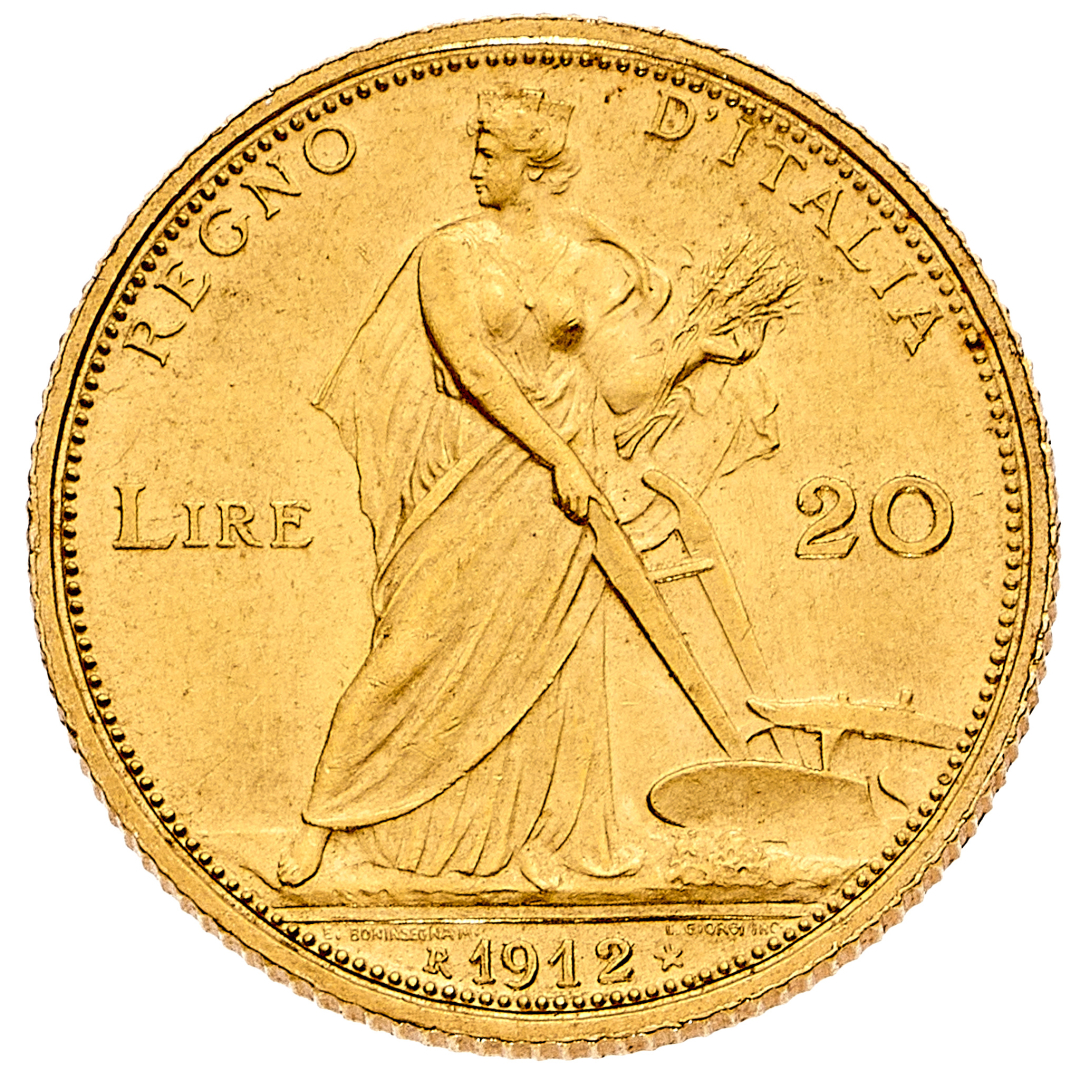 20 Lire Aratrice 1912 - Zecca: Roma - Diritto: effigie del Re a sinistra - Rovescio: allegoria dell'Italia agricola con aratro e fascio di spighe - gr. 6,45 - q.FDC