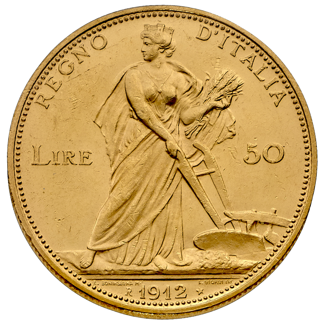 50 Lire Aratrice 1912 NGC MS 62 - Zecca: Roma - Diritto: effigie del Re a sinistra - Rovescio: allegoria dell'Italia agricola con aratro e fascio di spighe - Cert. #8585045-018