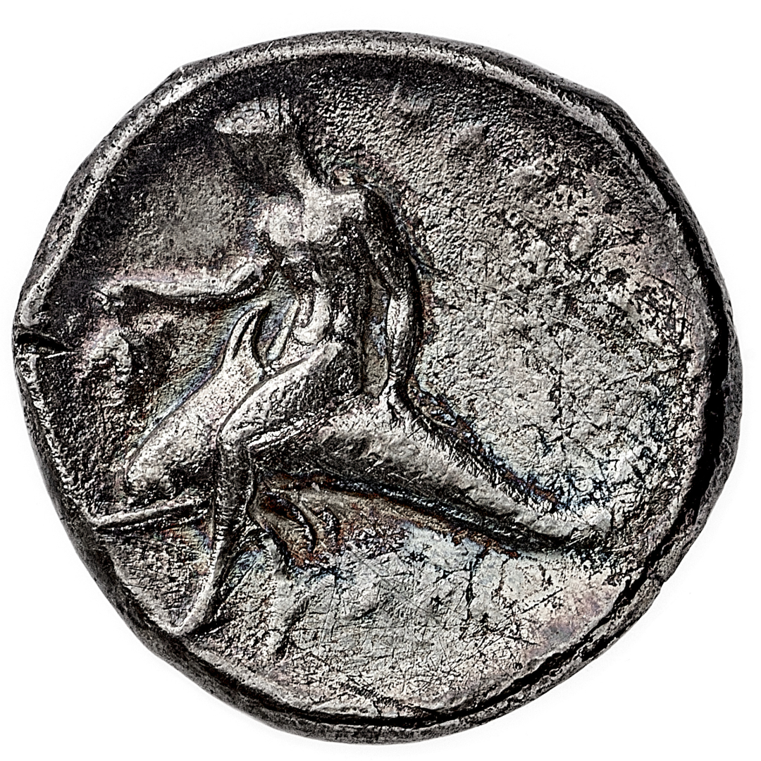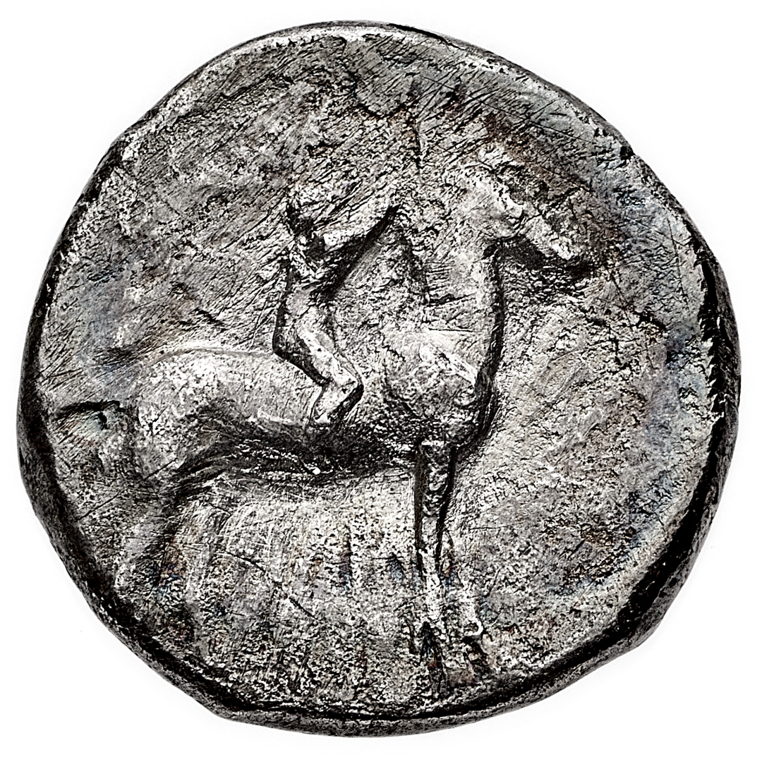 Taranto - Didramma databile al periodo 302-281 a.C. - Diritto: giovane cavaliere incorona il cavallo in movimento verso destra - Rovescio: Taras, in groppa al delfino verso sinistra, tiene un grappolo d'uva con la mano destra - gr. 7,30 - Patina di medagliere, BB