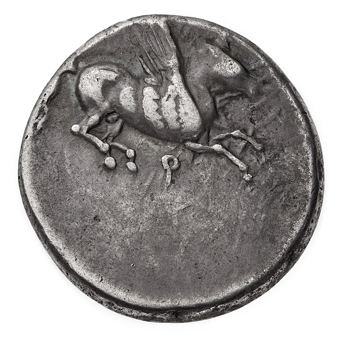 Corinto - Statere databile al 300 a.C. - Diritto: Pegaso in volo verso destra - Rovescio: testa elmata di Atena a sinistra ornata da una corona di alloro; nel campo a destra una statua di Zeus - gr. 8,45 - Migliore di BB