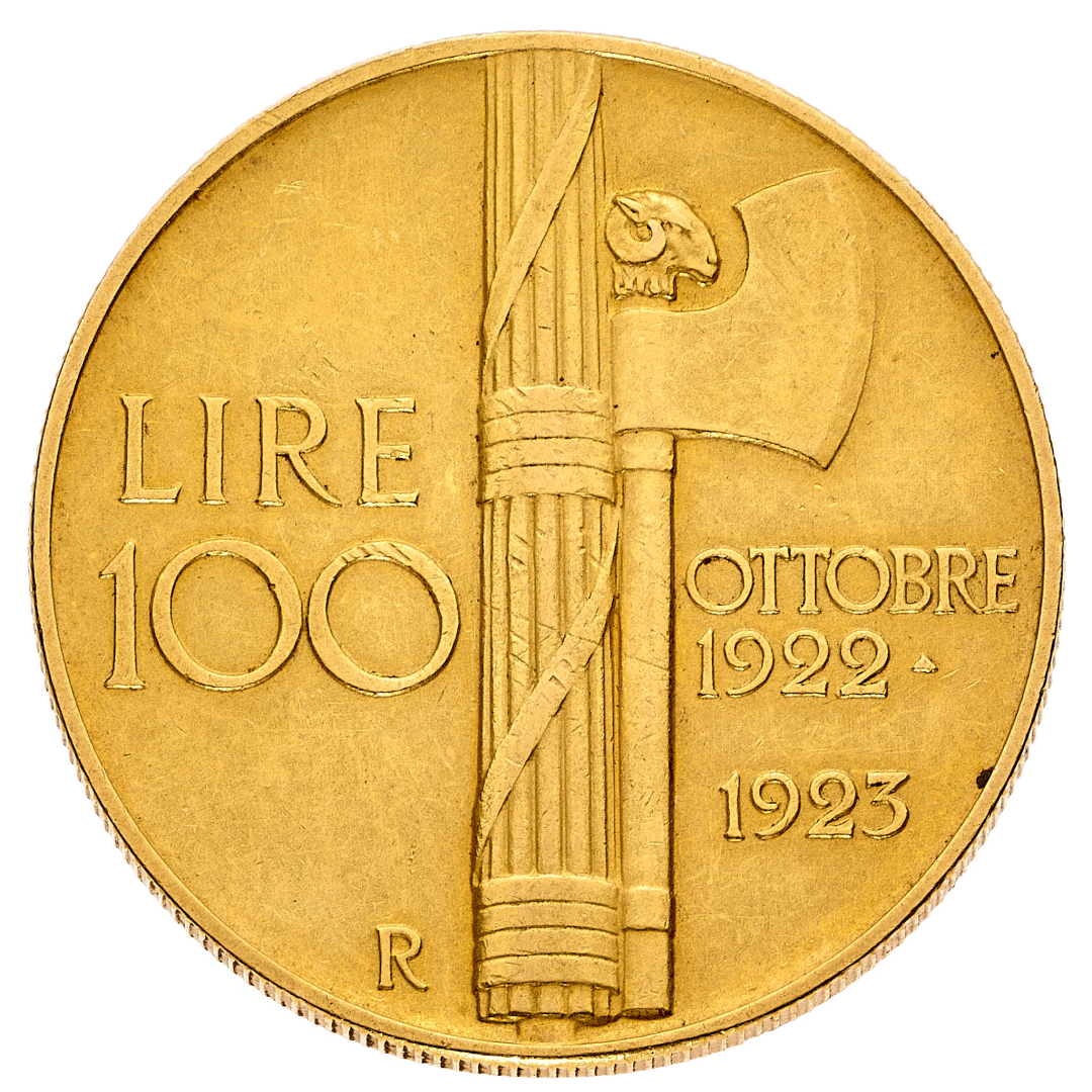 100 Lire Fascio 1923 - Zecca: Roma - Diritto: effigie del Re a sinistra - Rovescio: fascio littorio con scure a destra - gr. 32,25 - Segni di contatto, SPL