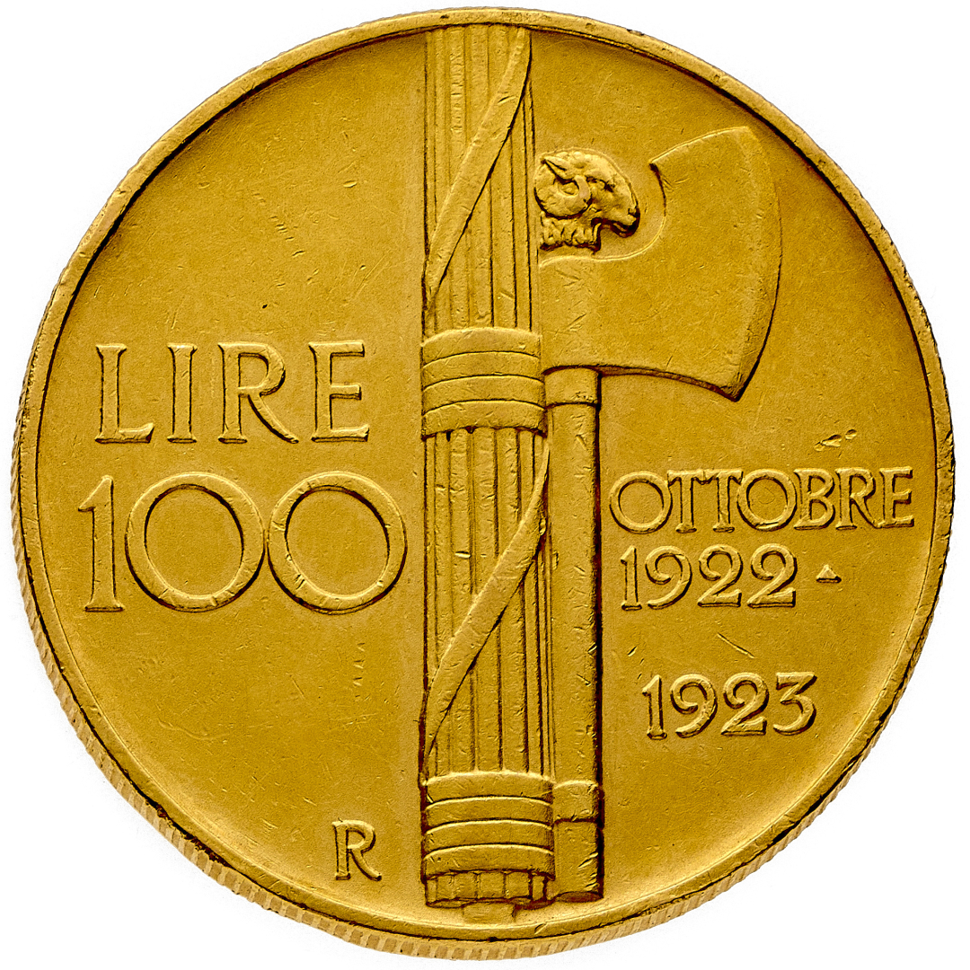 100 Lire Fascio 1923 - Zecca: Roma - Diritto: effigie del Re a sinistra - Rovescio: fascio littorio con scure a destra - gr. 32,24 - Lievi colpetti sul contorno, BB