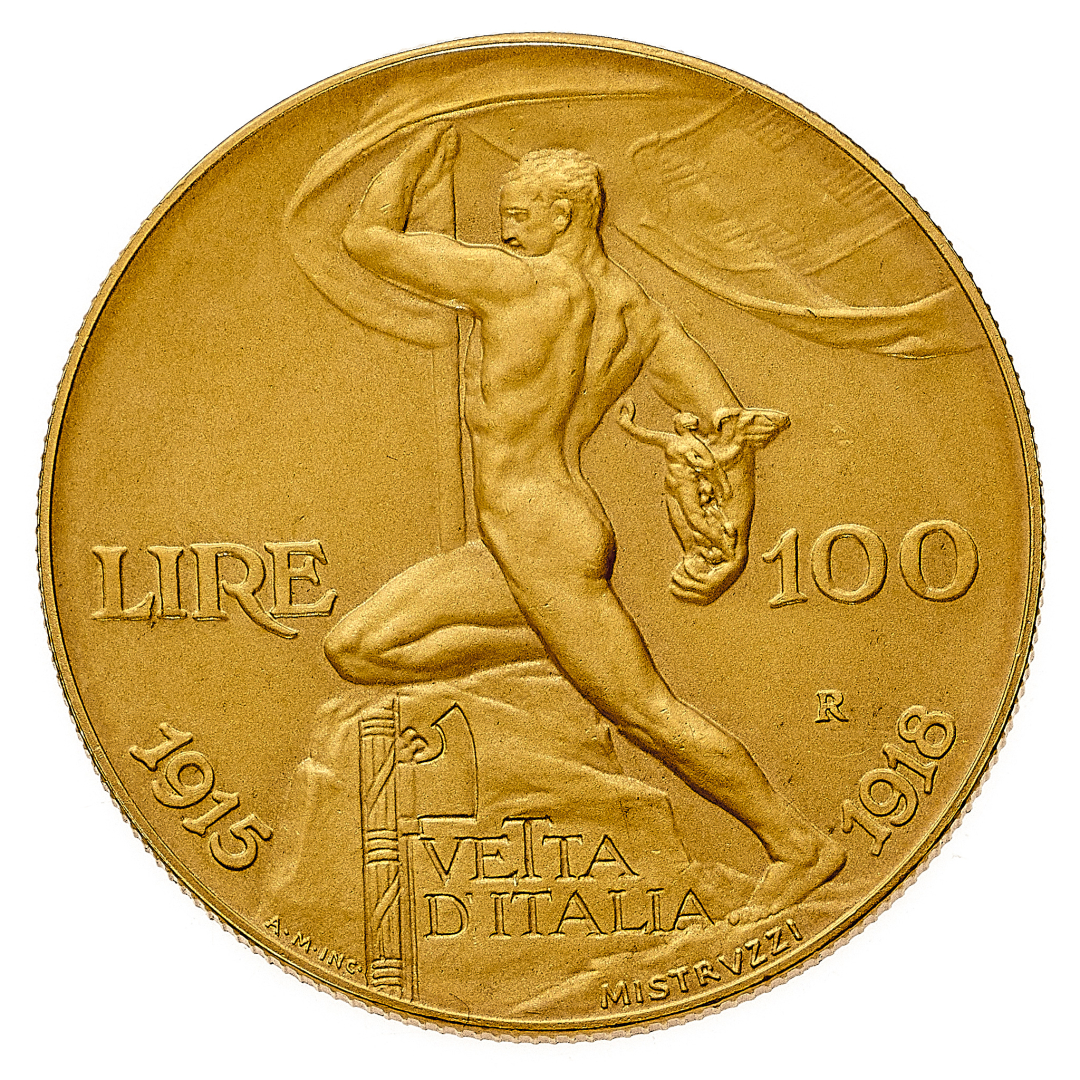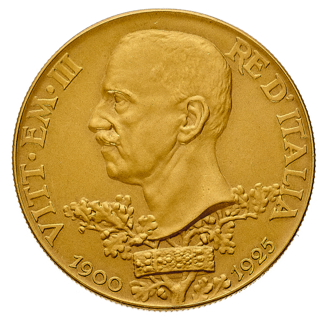 100 Lire Vetta d'Italia 1925 - Zecca: Roma - Diritto: effigie del Re a sinistra - Rovescio: figura maschile nuda con bandiera sabauda nella mano sinistra e Vittoria alata nella destra - gr. 32,25 - Rara soprattutto in questa conservazione - Praticamente FDC