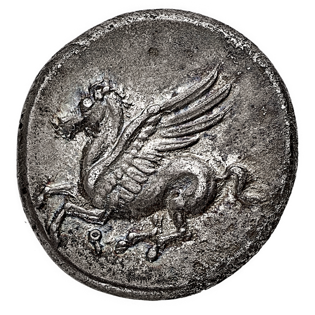 Corinto - Statere databile al periodo 345-307 a.C. - Diritto: Pegaso con le redini sciolte, in volo verso sinistra - Rovescio: testa elmata di Atena a sinistra; nel campo a destra un'egida - gr. 8,42 - Lieve porosità del metallo, altrimenti SPL