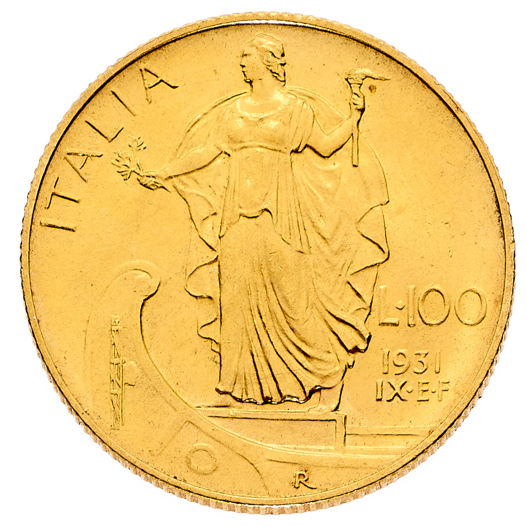 100 Lire Italia su Prora 1931 Anno IX - Zecca: Roma - Diritto: effigie del Re a sinistra - Rovescio: l'Italia ritta su prora con fiaccola e ramo d'ulivo - gr. 8,79 - q.FDC