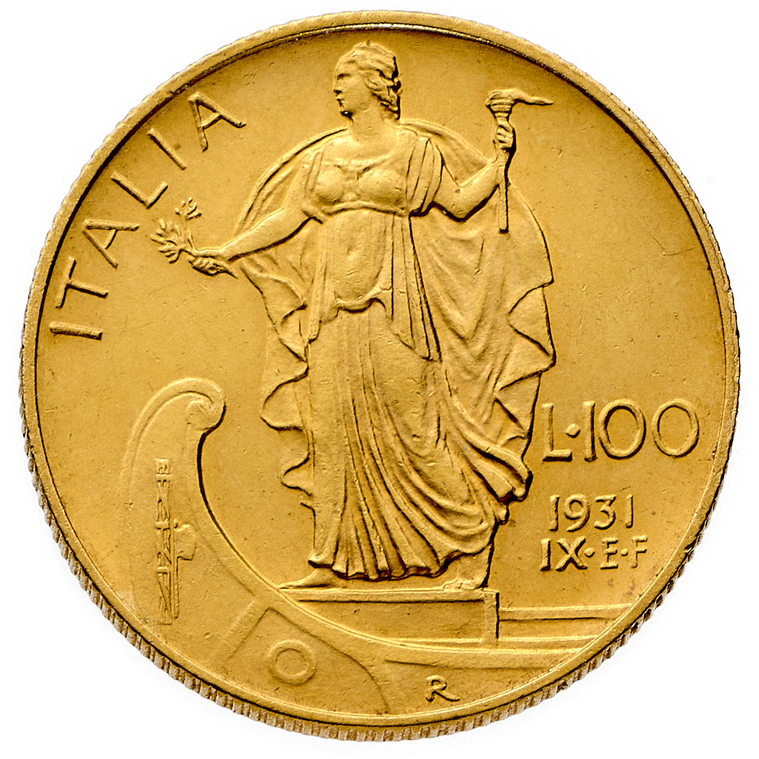 100 Lire Italia su Prora 1931 Anno IX - Zecca: Roma - Diritto: effigie del Re a sinistra - Rovescio: l'Italia ritta su prora con fiaccola e ramo d'ulivo - gr. 8,80 - Migliore di SPL