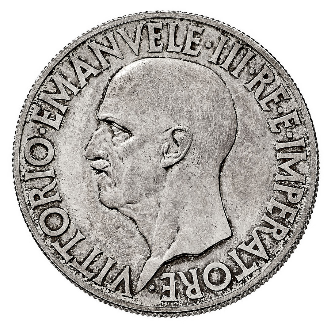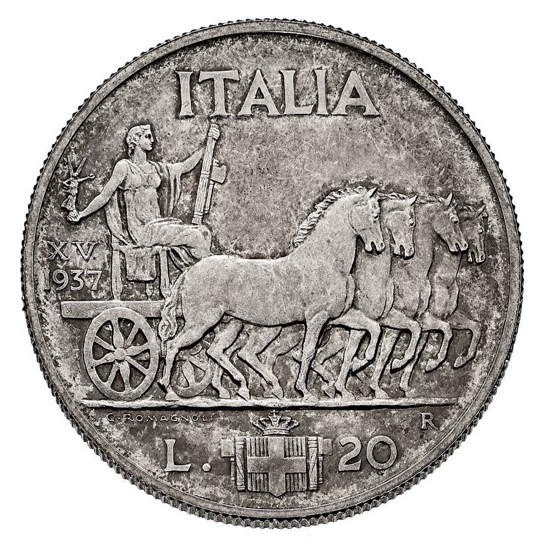 20 Lire Quadriga 1937 - Zecca: Roma - Diritto: effigie del Re a sinistra - Rovescio: l'Italia seduta con fascio e Vittoria su quadriga al passo verso destra - gr. 19,99 - Di grande rarità, solo 50 esemplari coniati - Praticamente FDC