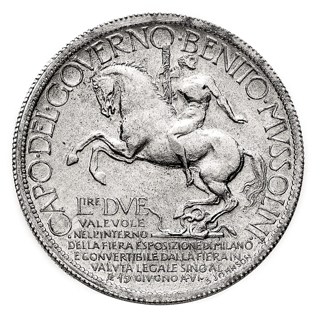 Gettoni monetali - Prova in alluminio del 2 Lire Fiera di Milano 1928 - Zecca: Stabilimento Johnson Milano - Diritto: effigie del Re a destra - Rovescio: littore nudo su cavallo rampante a destra - gr. 4,37 - Contromarche al diritto, q.FDC