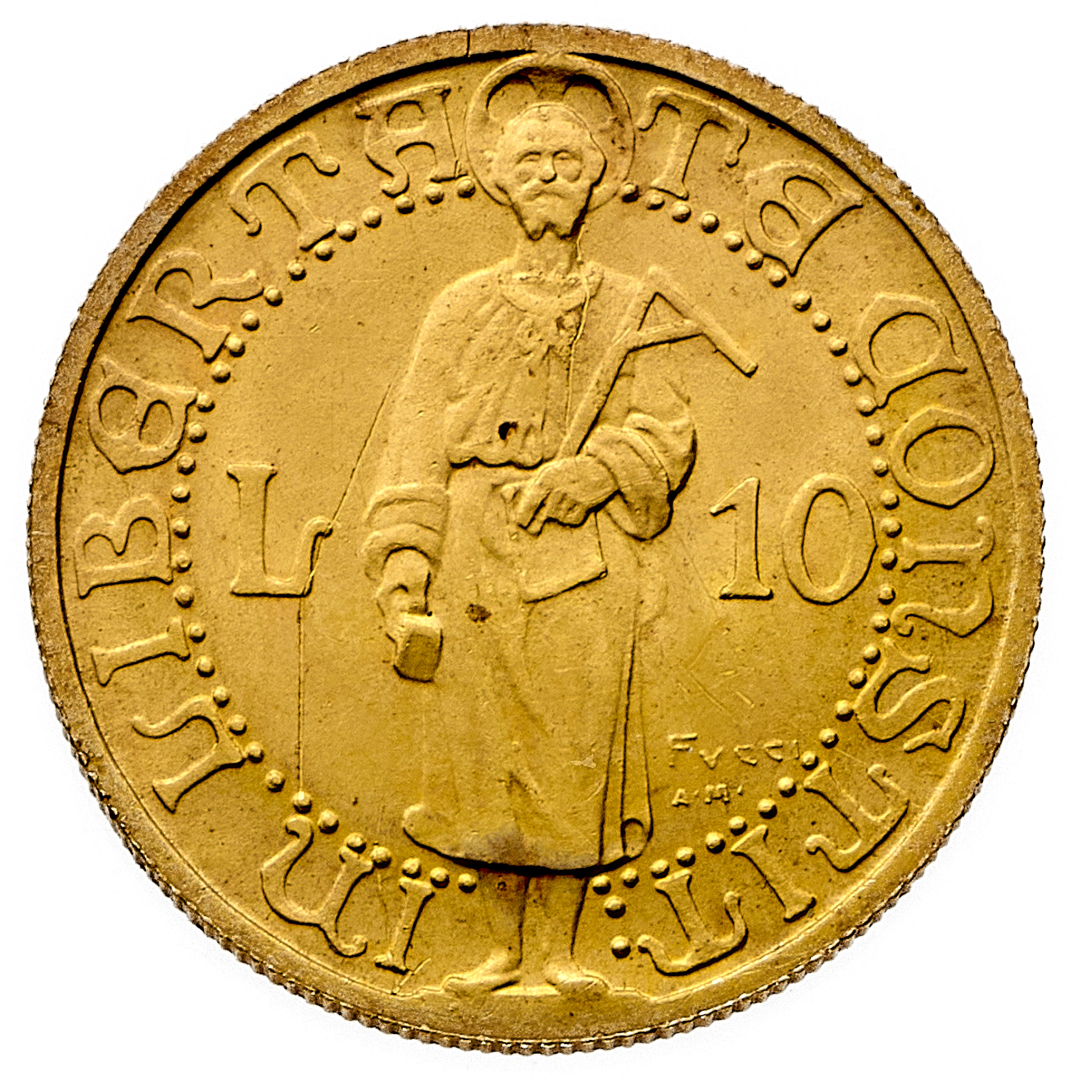 Vecchia monetazione (1864-1938) - 10 Lire 1925 - Zecca: Roma - Diritto: tre torri piumate - Rovescio: San Marino stante di fronte - gr. 3,21 - Rara - q.FDC