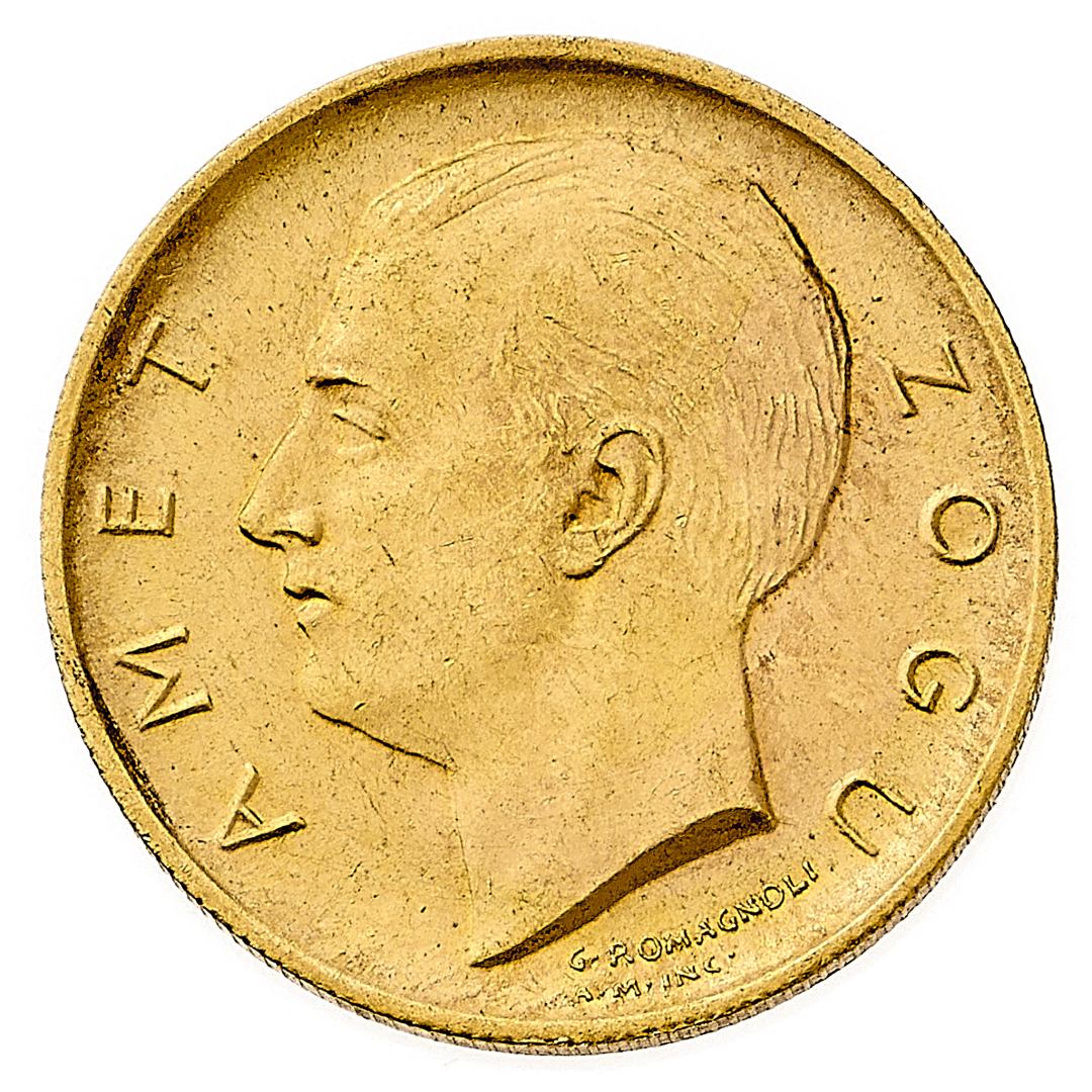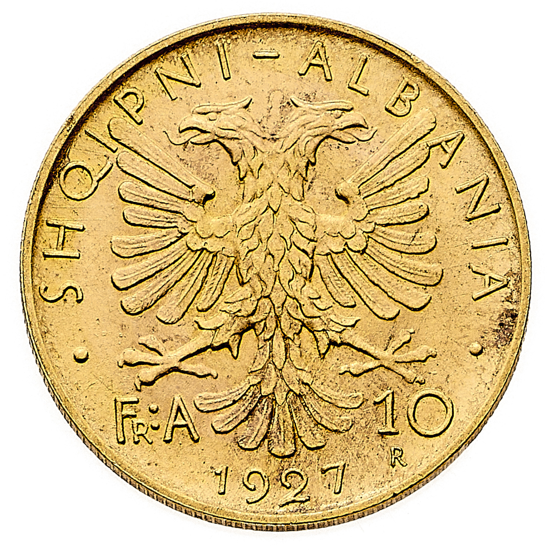 Amet Zogu (1925-1939) - 10 Franga Ari 1927 - Zecca: Roma - Diritto: effigie del Re a sinistra - Rovescio: aquila bicipite - gr. 3,22 - Migliore di SPL