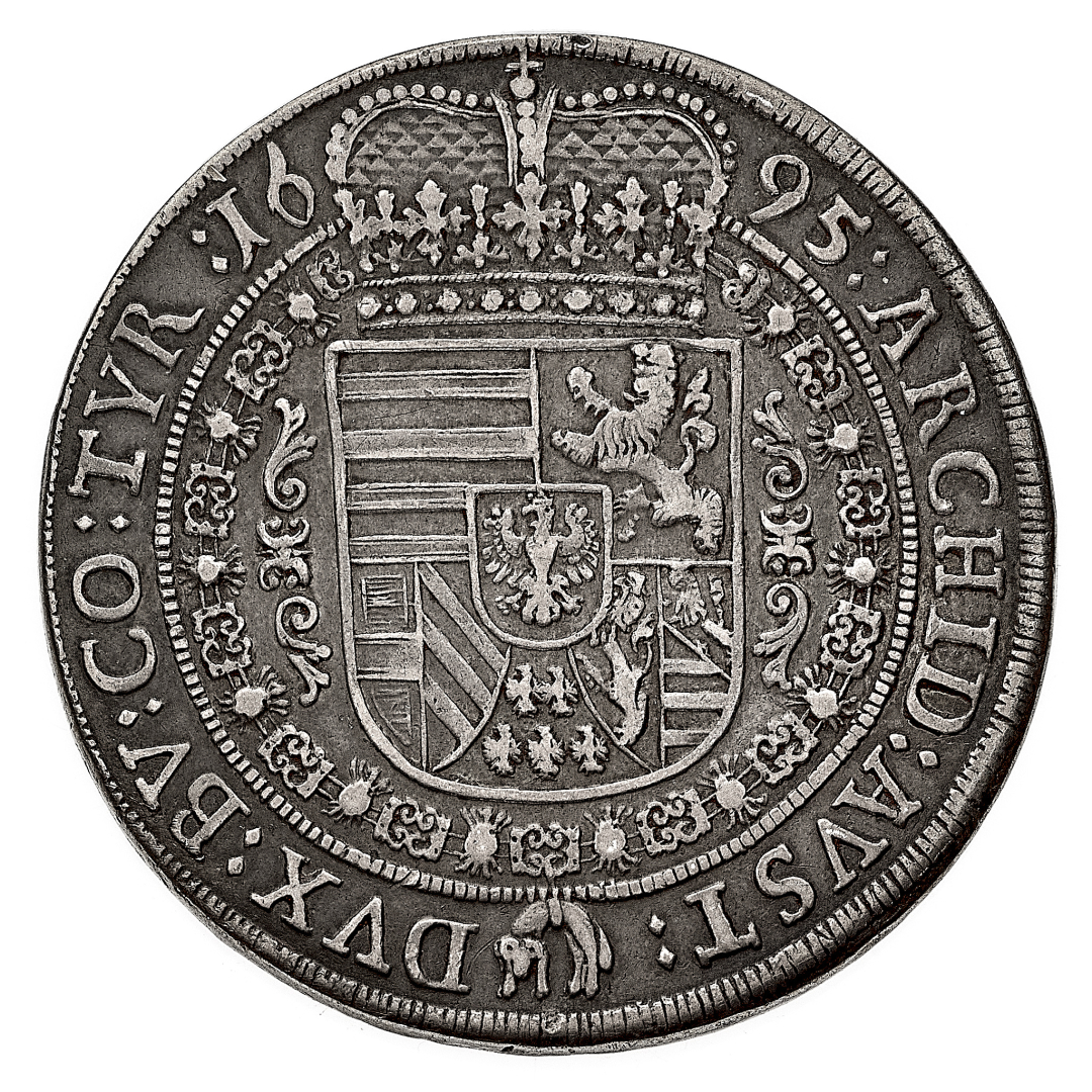 Leopold I (1658-1705) - Tallero 1695 - Zecca: Hall - Diritto: busto di Leopold I a destra - Rovescio: stemma coronato - gr. 28,49 - Patina di medagliere, migliore di BB