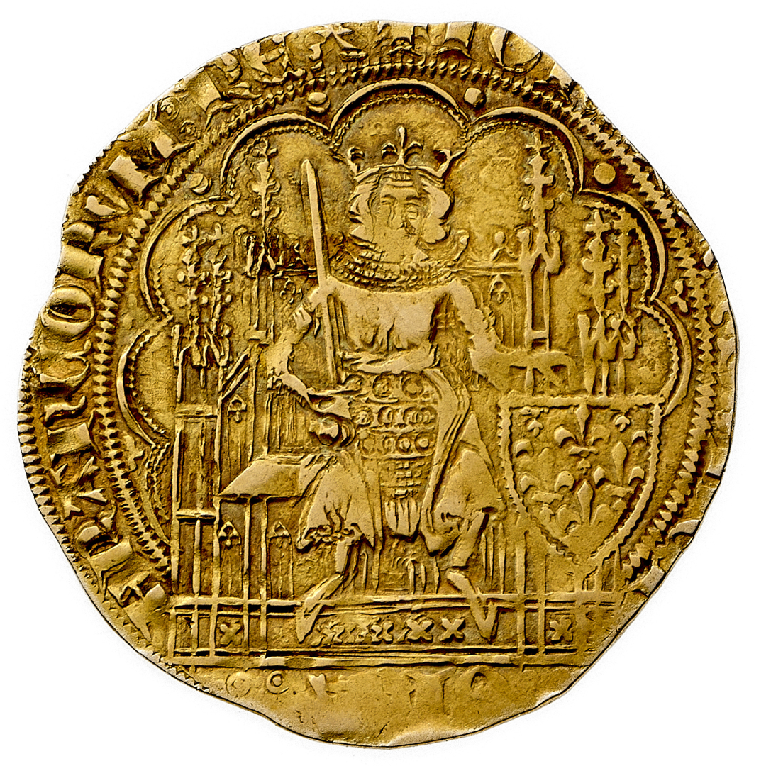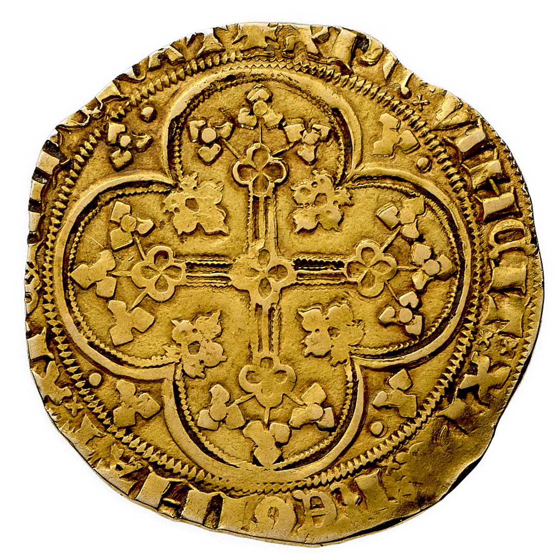 Jean II Le Bon (1350-1364) - Ecu d'or "à la chaise" - Diritto: il Re seduto su un trono regge con la mano destra una spada e con la sinistra lo scudo di Francia - Rovescio: croce fiorata entro doppia cornice quadrilobata - gr. 4,47 - Leggermente tosata, BB
