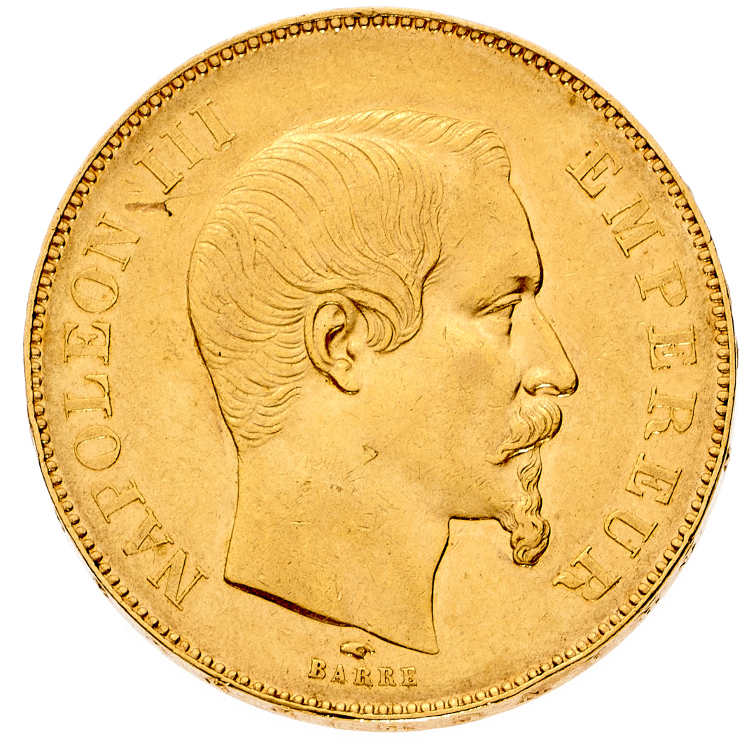 Napoleone III (1852-1870) - 50 Franchi 1857 - Zecca: Parigi - Diritto: effigie di Napoleone III a destra - Rovescio: stemma napoleonico entro maestoso padiglione coronato - gr. 16,12 - Lievi colpetti al contorno e segni di contatto, q.SPL