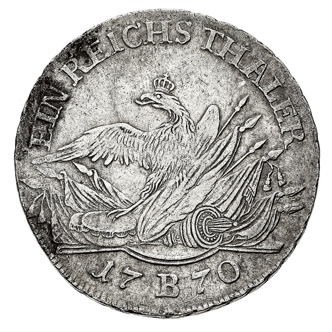 Brandeburg-Preussen - Friedrich II (1740-1786) - Reichstaler 1770 - Zecca: Breslau - Diritto: effigie di Friedrich II a destra - Rovescio: aquila coronata poggia su un trofeo d'armi - gr. 21,81 - Migliore di BB