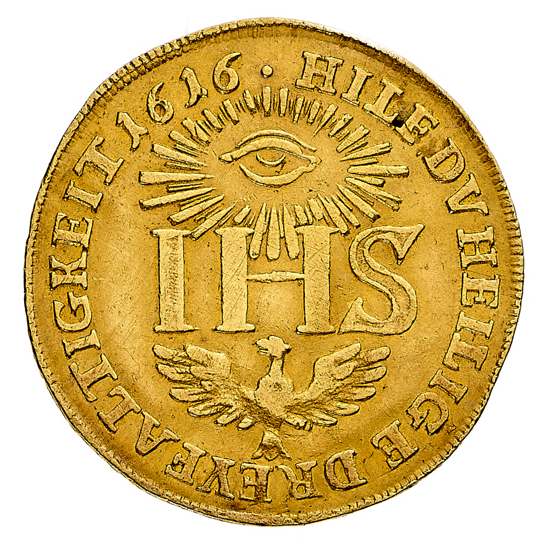 Sachsen - Johan Georg I (1615-1656) - Ducato 1616 - Diritto: lettere CS intrecciate sovrapposte a due spade incrociate e sormontate da una corona - Rovescio: lettere IHS sormontate da un occhio radiato e con colomba sottostante - gr. 3,41 - Migliore di BB